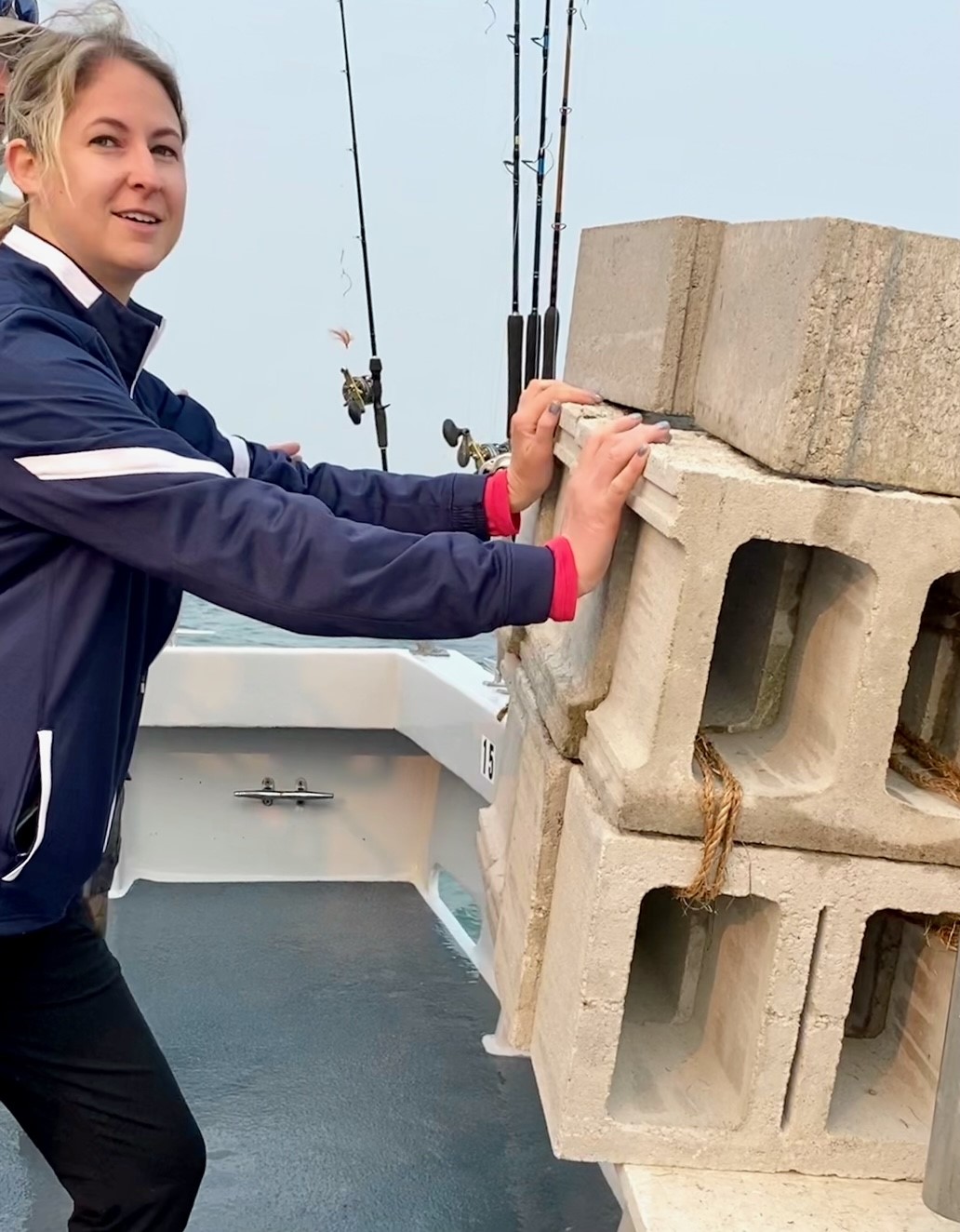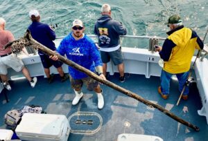 Mercy.. Two pretty days in a row. What are we to think? Sure enjoyable. Maria gave today’s reef blocks a good shove atop the newly chosen site for the Freedom – it will become Jim Reinknecht’s Memorial Reef.. I was going to drop the Freedom in shallower water, but Jim Reinknect’s folks have something else in mind and have fundraised to see it through. No Worries! Our SCUBA and freedive supporters are mighty lucky to have Capt. Jerimiah on their team. He’s got a tug and barge coming for a shallow water site. I’m looking forward to deploying all of it and more! Fishing today was a test of clients’ work ethic; sometimes crickets or lots of throwbacks. Things improved after lunch with the fish pool changing hands several times. As ever, fish bit better when it was time to leave – so we stayed on a while more and boxed some folks up into double digits (including Hurricane Murray which should tell you they were REALLY biting..) Jigmaster Tom even sealed the deal with a limit. At day’s end Maria’s reef building karma wasn’t enough to override John’s golden horseshoe. He edged her out of the pool by the thinnest of margins. Weather looks fit again tomorrow. See what the day brings..Cheers, Monty