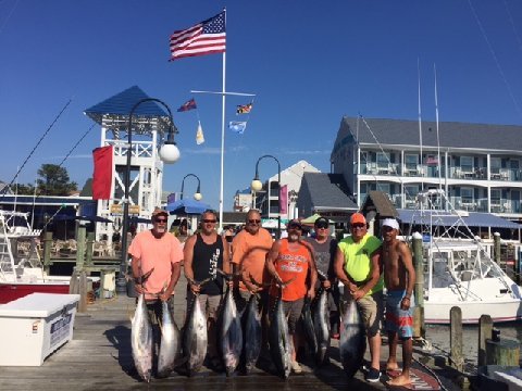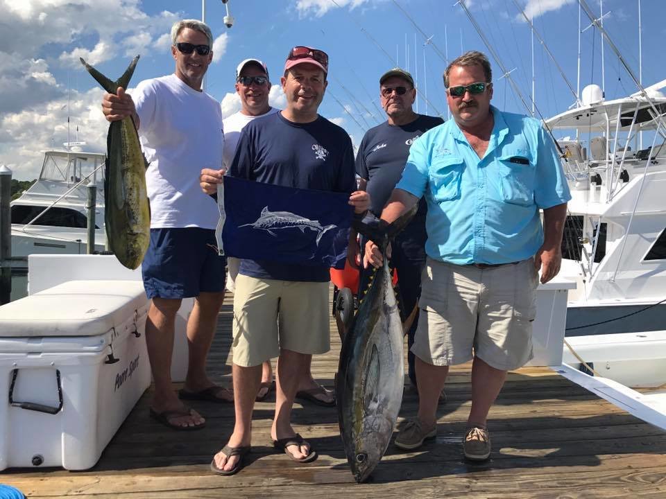 Captain Mark Hoos and mate Mark Stephens are a couple of the busiest guys in the charter business. They fish pretty much every day for the next few months and have won the Ocean City Marlin Club award for most tuna by a charter boat like 14 years straight. Knowing that it will be no surprise that they had a good day today. Today Sam Connors from Lewes DE. and his crew mugged up the big yellowfin on the MARLI. They also released four additional yellowfin and a white marlin.