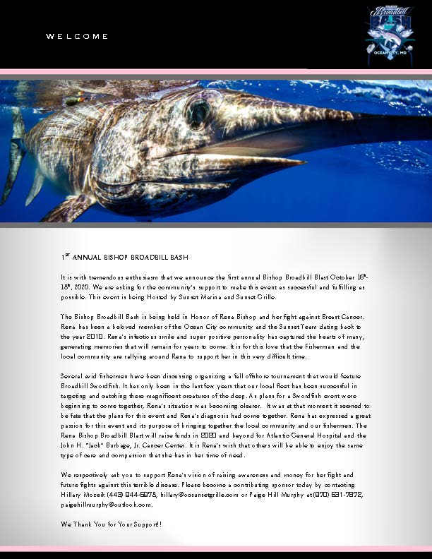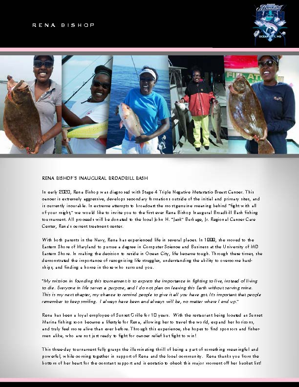 The Bishop Broadbill Bash is being held in Honor of Rena Bishop and her fight against Breast Cancer. Rena has been a beloved member of the Ocean City community and the Sunset Grille team dating back to the year 2010. Rena’s infectious smile and super positive personality has captured the hearts of many, and now we hope our community will join together to support her in this very difficult time.