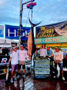 I just got back from the awards ceremony at the 8th Annual Huk Big Fish Classic Tournament and it was awesome! I helped hand out checks totaling over $1 Million and more than 1/2 of that went to one boat. That boat caught the first place BIG FISH and it was a true sea monster and will most likely be the first ever state record for swordfish in Maryland. The MD DNR made swordfish a state record consideration just a few years ago thanks to an expanding fishery off of our coast with a qualifying minimum weight of 350 pounds originally that was dropped to 300 pounds in December 0f 2020. Several swordfish have been caught over 300 pounds since it became available for state record consideration, but all were caught on electric or hydraulic reels. In order for any fish to be considered for a record it must be caught by rod and reel and that’s exactly what happened this weekend. The crew of the Real One fishing out of Sunset Marina caught a 301 pound swordfish weighed on day two of the Big Fish Classic and that fish was verified by Erik Zlokovitz of the MD DNR last night (Thanks for driving down E!). The big swordfish will be “pending” until all of the paperwork is completed. Once that happens it will go down in the Maryland record books for angler Pete Schultz and the crew of the Real One.