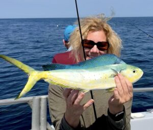 Worth it too. At last we had a steadily improving bite; then a taste of mahi mayhem – lots of fish on at once! Now with my client’s expectations sky high, Murphy must have about died laughing. We caught no more after the blitz.