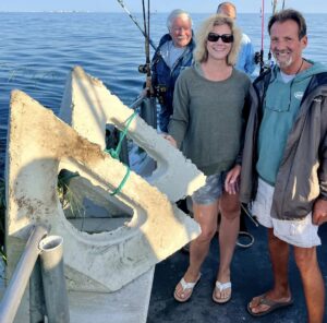 Theresa & Brad made today’s pyramid drop at Capt. Bob Gowar’s Memorial Reef. A big reef still growing: there are three Iron Lady loads of 110 tons precast concrete each, 4,670 reef blocks, 131 pyramids or so, the Tug “Steve’s Way” – Capt Bob’s Barge and an as yet unnamed tug.