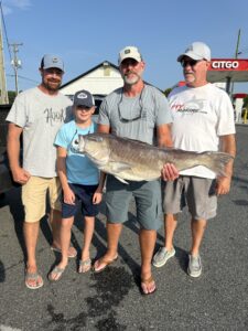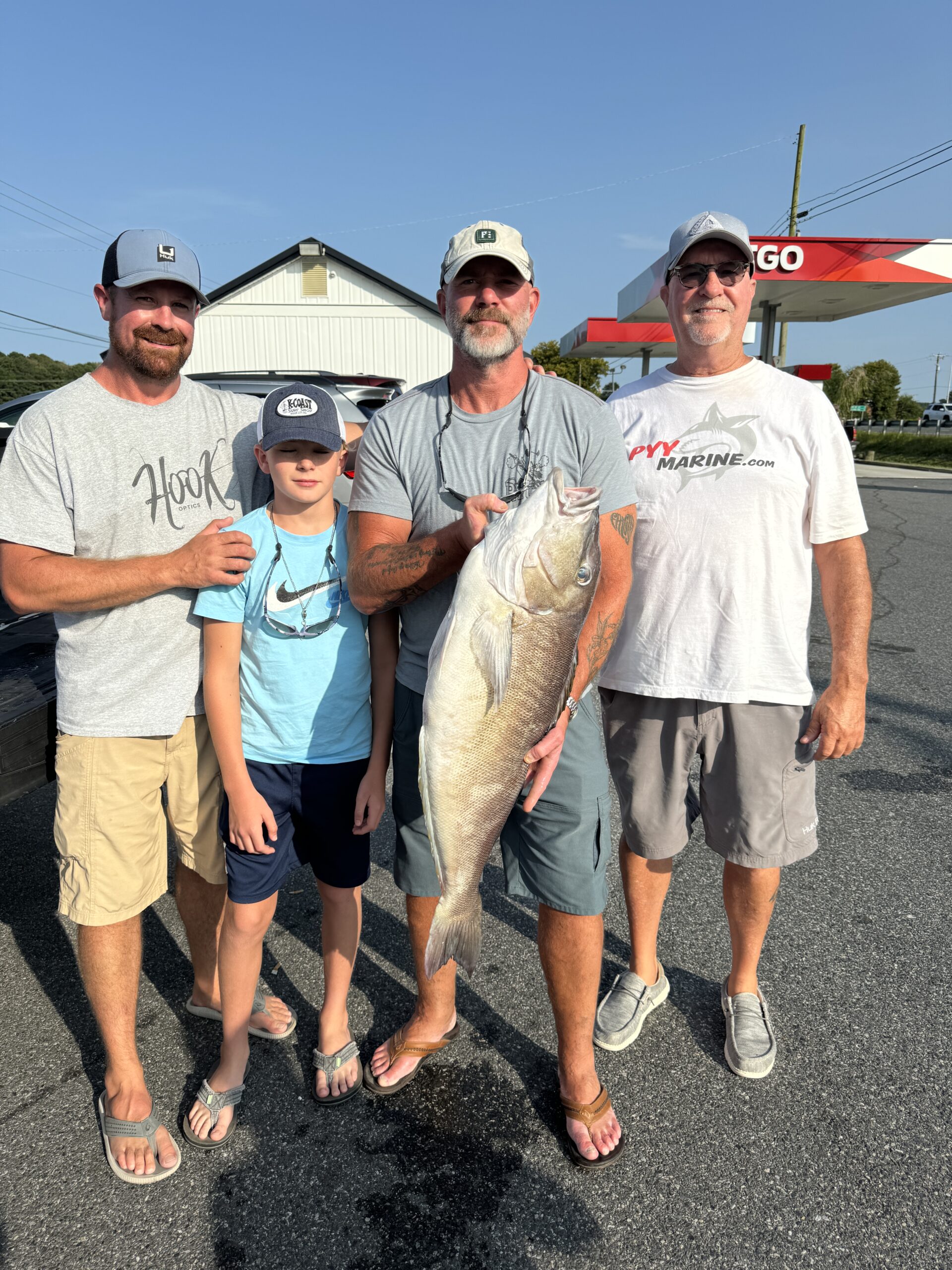 After our fishing trip I got a call from my sister’s boyfriend Shaun who had just returned from a trip aboard Talkin’ Trash with Captain Chris Little telling me he thought they might have a new state record blueline tilefish. I got in contact with my DNR buddy Erik Zlokovitz and the guys from Crabs to Go to set up a weigh-in and we weighed and measured the fish at about 5:30. The huge blueline was 37.25″ long and weighed in at 20.6 pound and broke the old state record of 20 pounds even. Angler London Anthony caught the big tile on Talkin’ Trash using a chunk bait. The state record will be considered “pending” until the paperwork is submitted and approved. Congratulations to London and the crew of Talkin’ Trash.