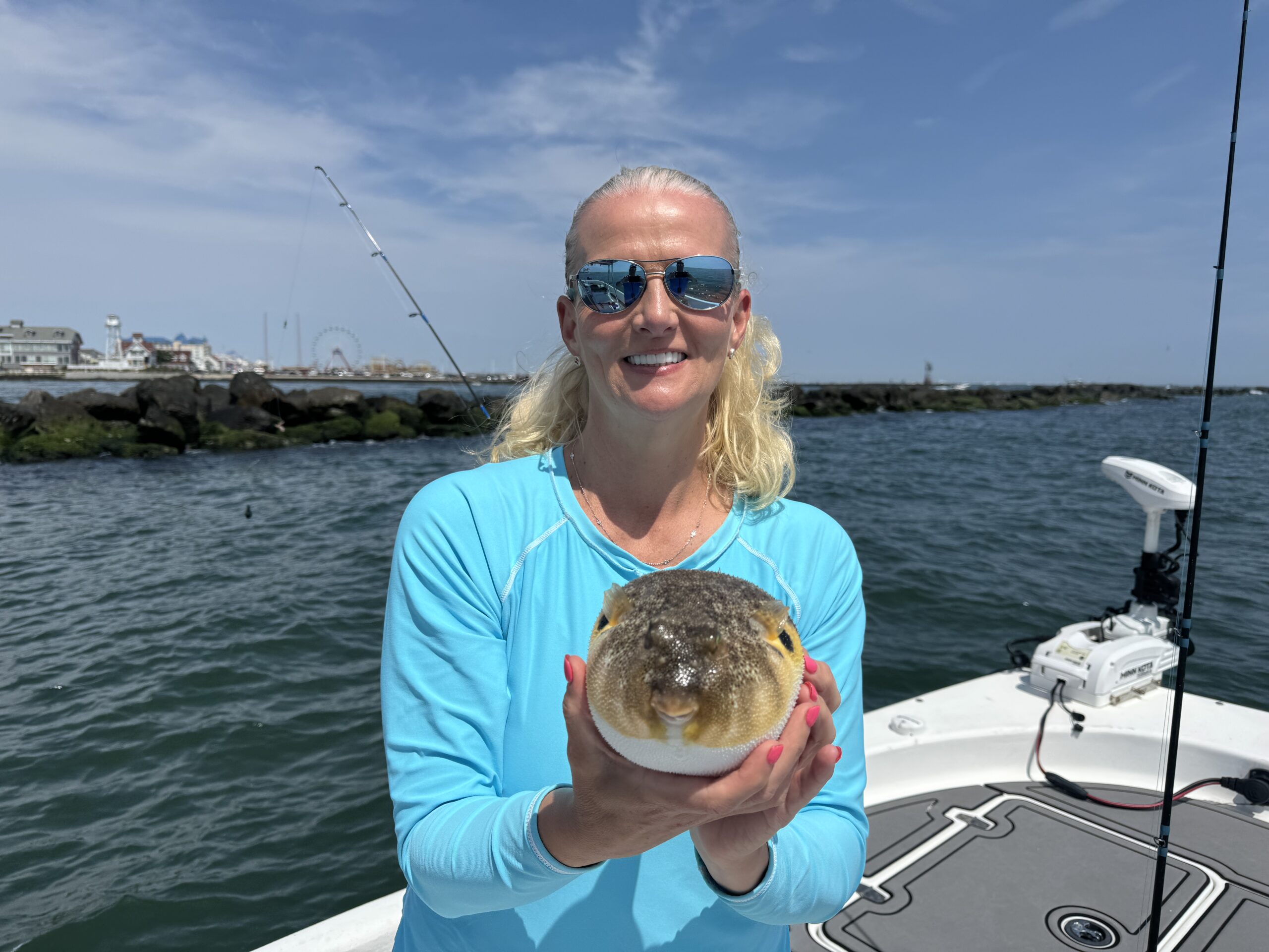 Kristen and I headed out to watch the OC Air Show from the boat this afternoon and did a little fishing while we were out there. It was a beautiful day on the water and we’ve never seen so many boats in the bay or nearshore ocean. It was certainly crowded, but everyone was well behaved and enjoyed an awesome show and some decent fishing. The tog and sheepshead didn’t cooperate for me, but Kristen did catch some blowfish that ate shrimp on our Deadly Tackle Hi-Lo Rigs.