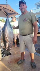 There will most likely be a new Maryland State Record for longfin albacore (Thunnus alalunga) when MD DNR confirms the catch. Today Captain Ryan Knapp and his crew on the private boat Top Dog fishing out of Sunset Marina landed a HUGE longfin while fishing the 800 squared off in the deep. The big tuna ate a naked ballyhoo on a “dink” rod and weighed in at a whopping 78 pounds. This beats the old MD State Record set back in 2004 by 4 pounds and is just one pound shy of the all tackle world record. Congratulations to Captain Ryan and crew!! Thanks to Sunset Marina and Hooked on OC for the pics!