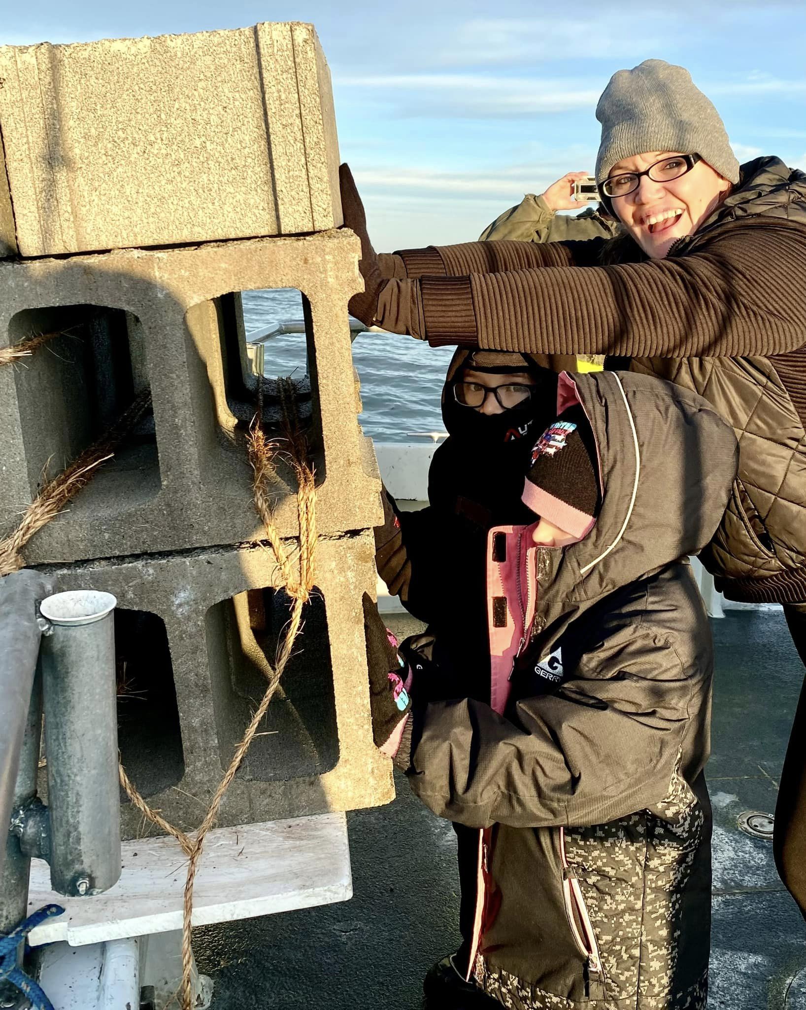 Samantha and her bundled up young helpers, Jerimiah & Jazmyn, gave reef block 38,660 a hearty shove at Sue Foster’s Block Drop.