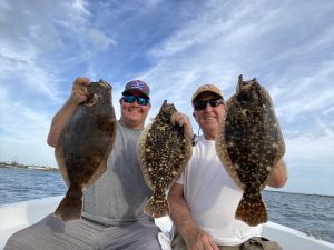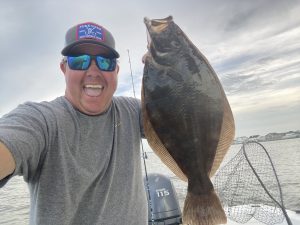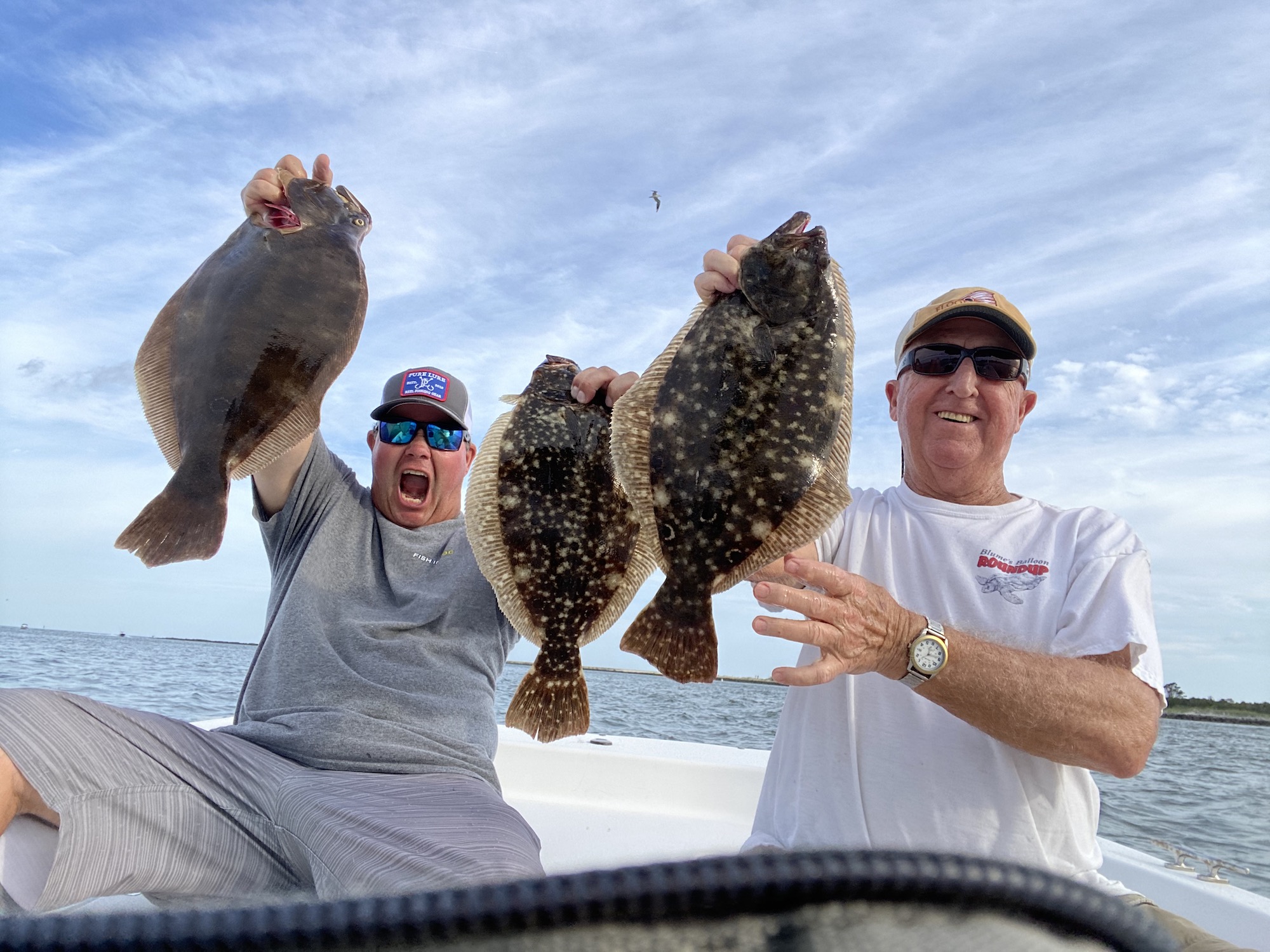I had the chance to go fishing with my long time friend Dale Timmons today and had an absolute blast. Dale is the inventor to the Deadly Double flounder rig and he and I both love flounder fishing so when I found out I had some time on my hands I shot him a text and we were on our way. I was using our Fish in OC Doormat Destroyer live bait rig and Dale used his own custom tied rigs and we both used some live bunker that I caught in the cast net this afternoon. We had fat fish of 19 1/2″, 20 1/2″ and I had a nice 23 1/4″ fish that was the biggest I’ve caught in a while. Dale said probably five pounds so I’m going with that. Great day on the water with my good friend catching some fish and chewing the fat!