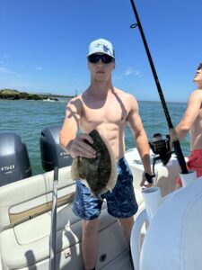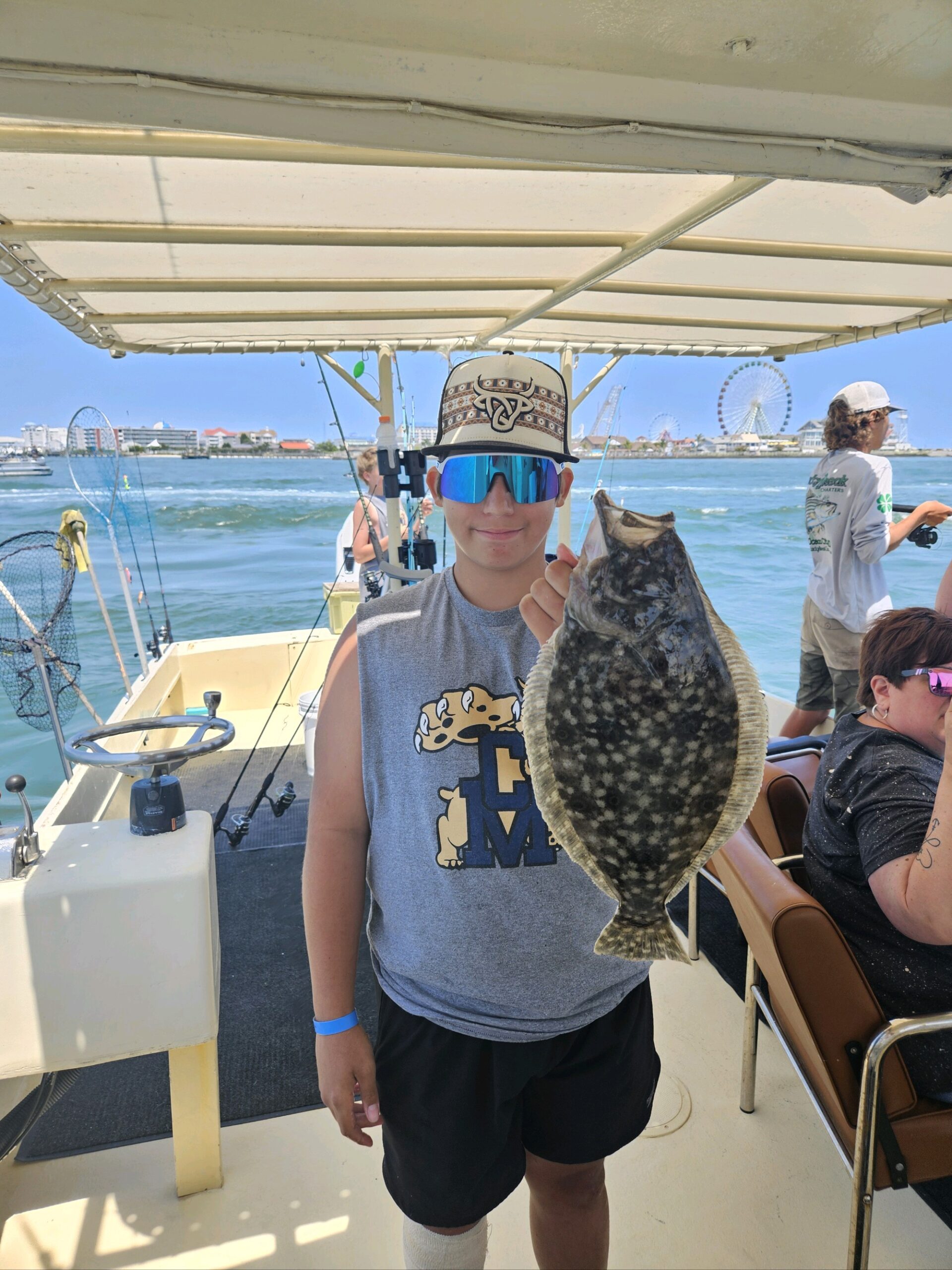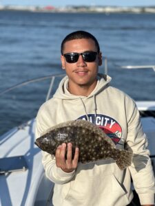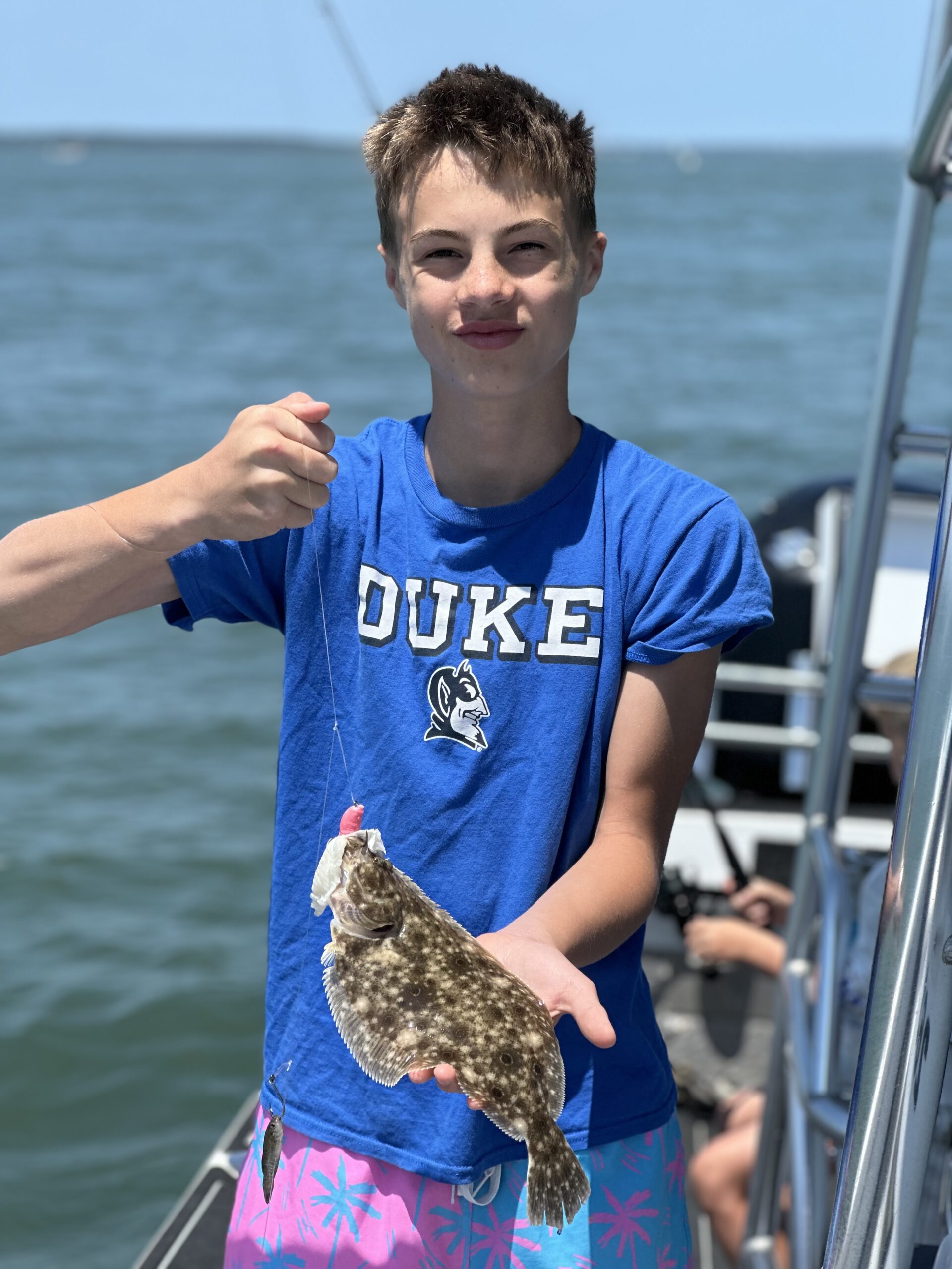 Cade Campbell, 17 years old of Nazareth, Pa. Caught an 18” flounder on a Roy Rig at the South Jetty last week along with some small blue fish.