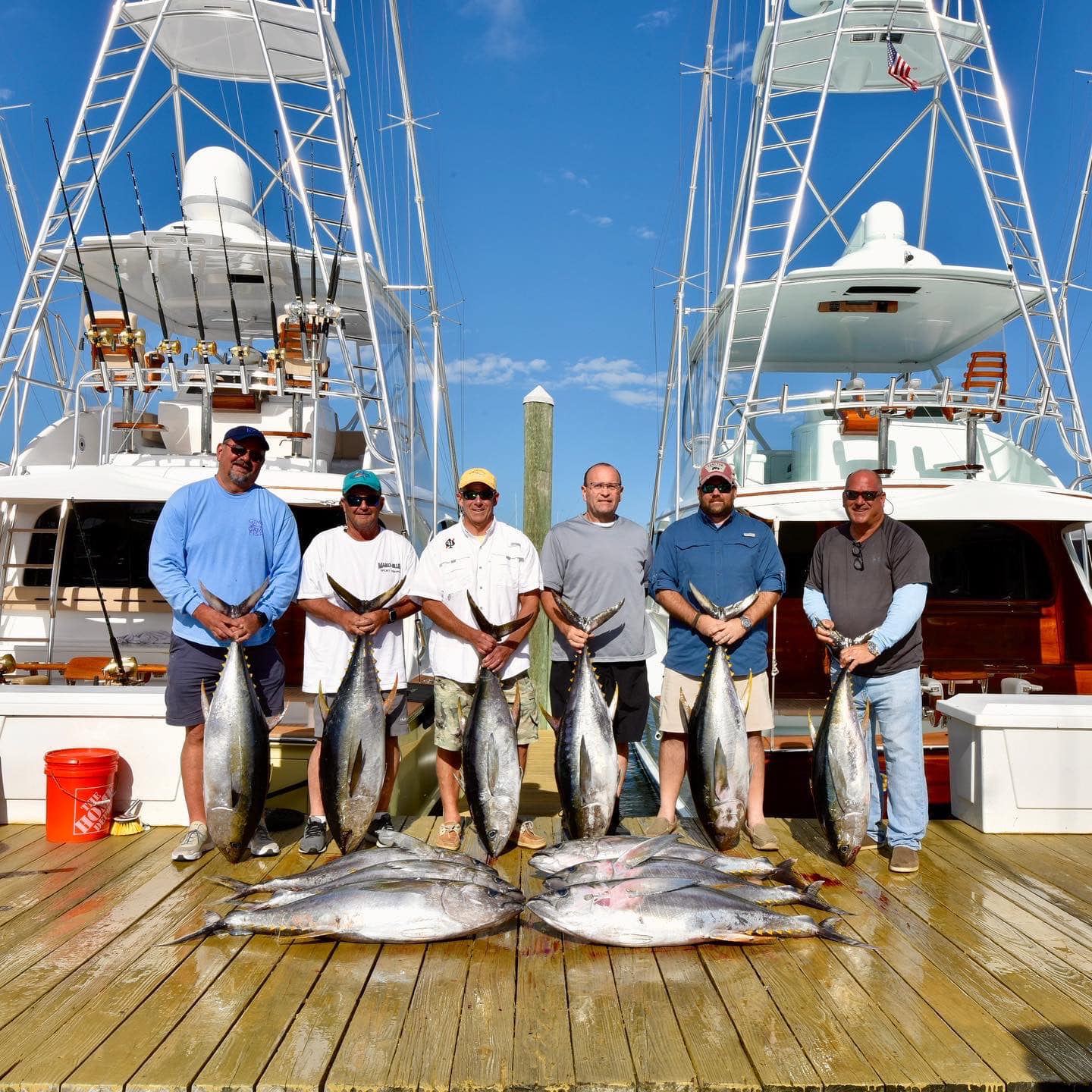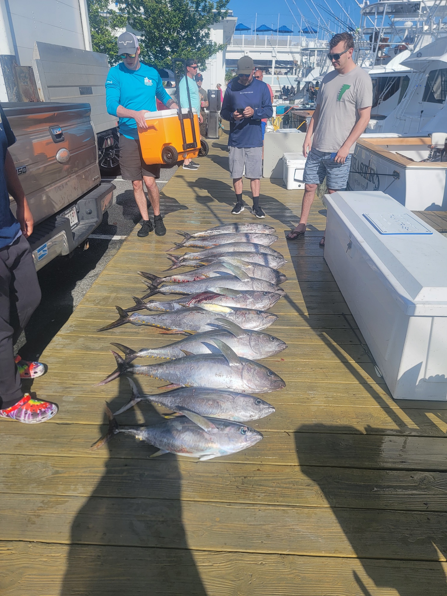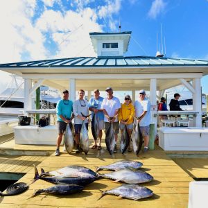 News from home is that it was a rough morning, but a good day of tuna fishing for those that went. Captain Mark Hoos of the MARLI had a great day out in the canyon today and loaded up his fish box with 13 very nice yellowfin tuna.