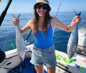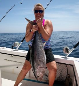 Captain Jeff Coats of Pitboss Fishing was #thinkingofyou today and took a trip just outside the Hot Dog today for his wife Karen’s day off and was able to put some tunas in the boat. Tia Schwalger from Gold Coast, Australia was able to catch her first tuna ever and Karen added another for two “under” bluefins. The crew also added a couple of skippies for a great day on the Bad Influence.