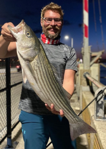 Inshore fisherman and kayak angler extreme Morgan Mericle made an impromptu trip to Ocean City last night with his brother and treated him to some terrific fishing from the route 50 bridge. Morgan’s brother caught his first ever keeper rockfish, Morgan added another keeper and a jumbo “chopper” bluefish for a great trip to Fish in OC.