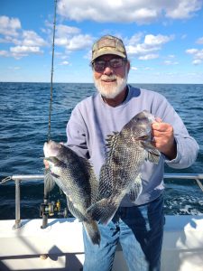 Captain Chris Mizurak of the Angler reported that it got a little bumpy this afternoon, but that was ok because the sea bass were biting well. Angler will be tied to the dock in tomorrow’s wind, but Friday and Saturday she’ll be sailing.