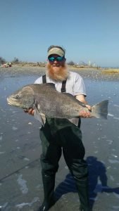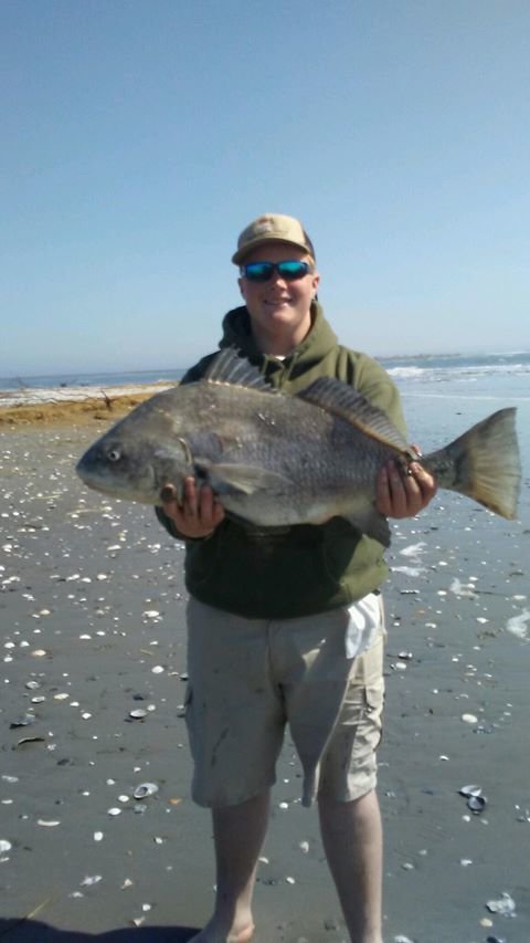 The father and son team of Ray and Asher Layton fished the Virginia surf yesterday where they both landed 32″ black drum while soaking clams.