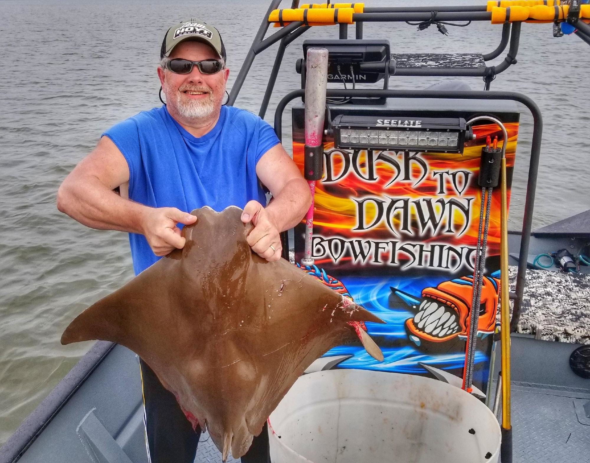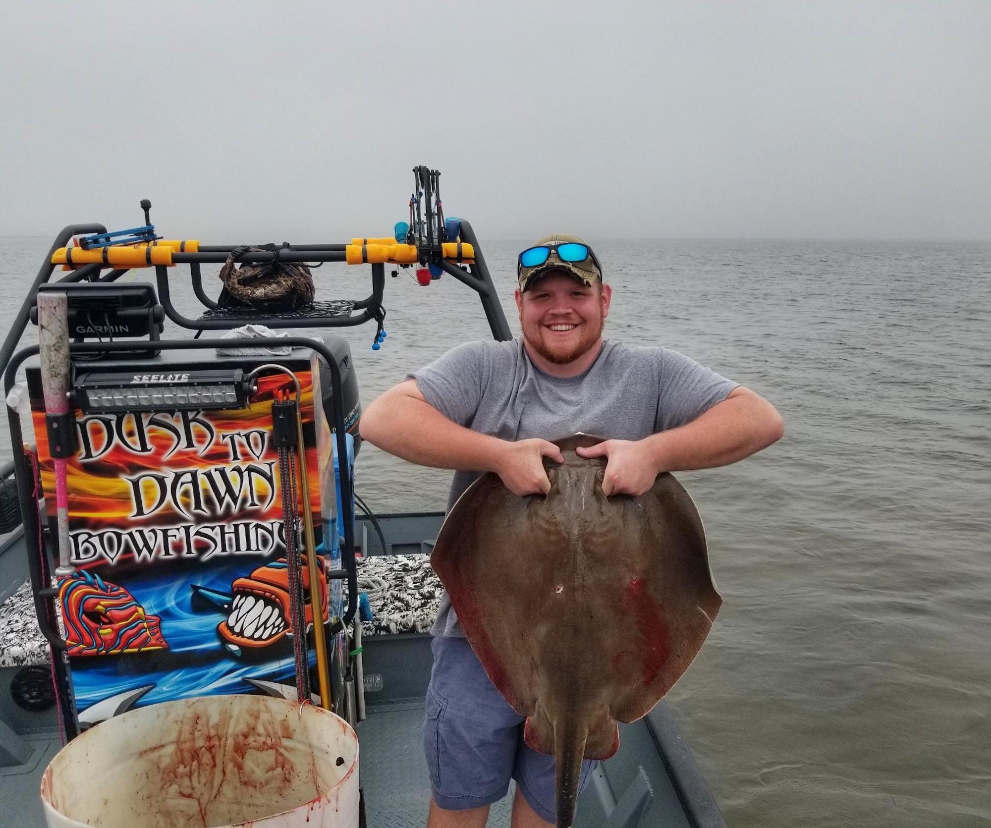 Shooters on Dusk to Dawn Bowfishing with Captain Marc Spagnola have had some good shooting despite the foggy, dreary conditions. Captain Marc knows where to find the rays and these shooters had good luck landing some nice cow nosed and southerns.