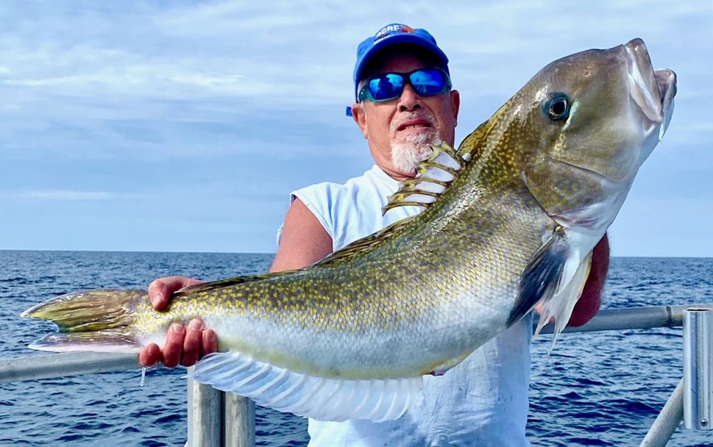 Local healer and angler extraordinaire, Dr C, set the pace with a 51 lb golden over the rail first. Jigmaster Tom was hot on his heels with a 50 pounder! (boat weight at sea – just big tiles!)