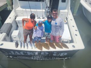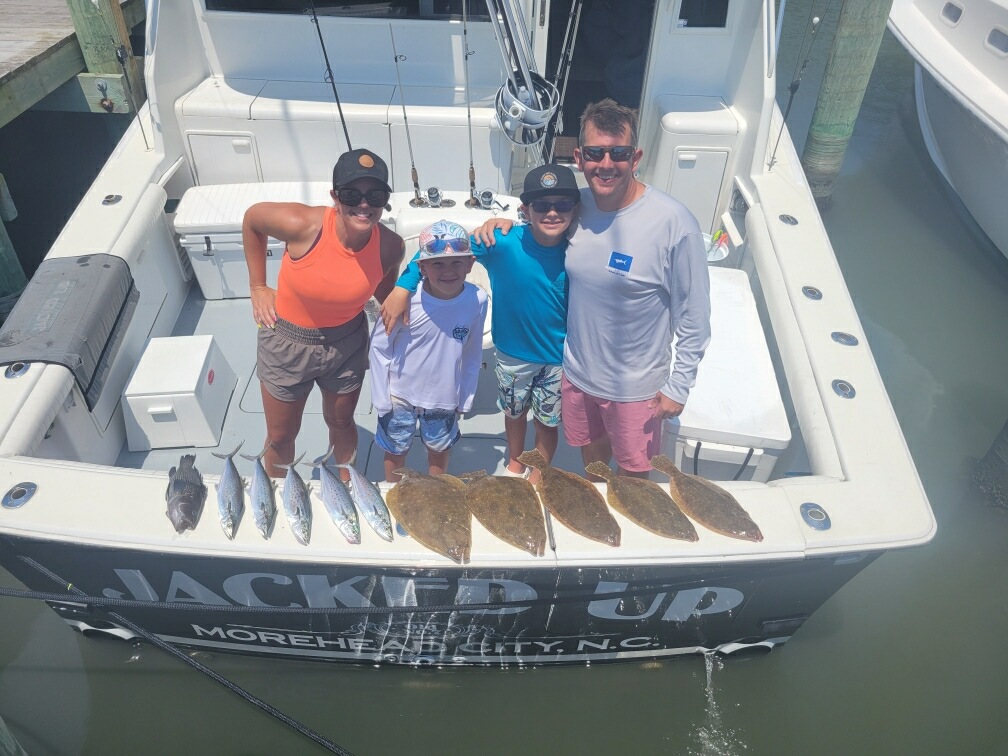The Meader family traveled from Kansas to fish with Captain Jeff Landis on board the Jacked Up out of Bahia Marina and he showed them some good fishing with Spanish mackerel, a sea bass and five nice flounder to 22″.