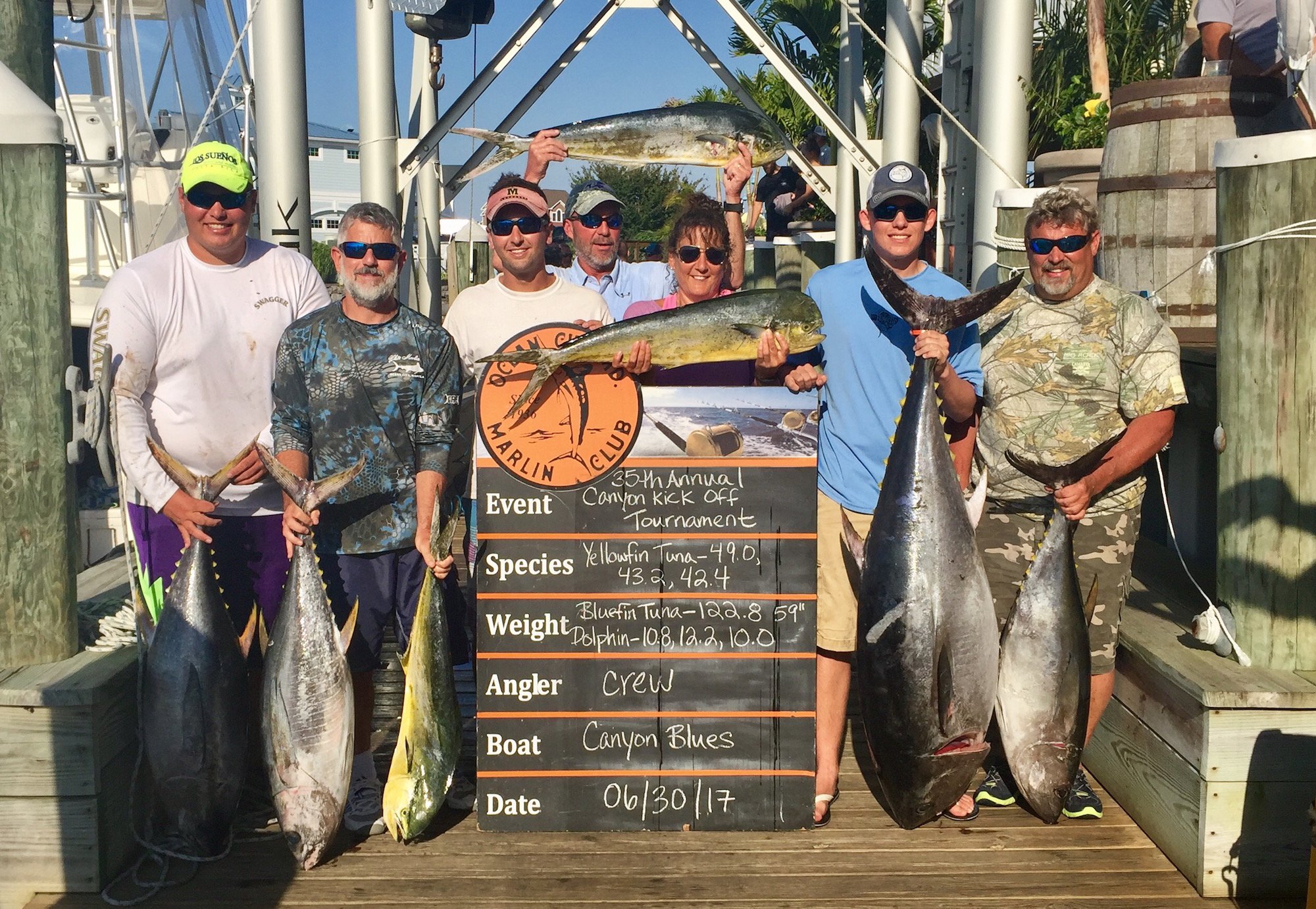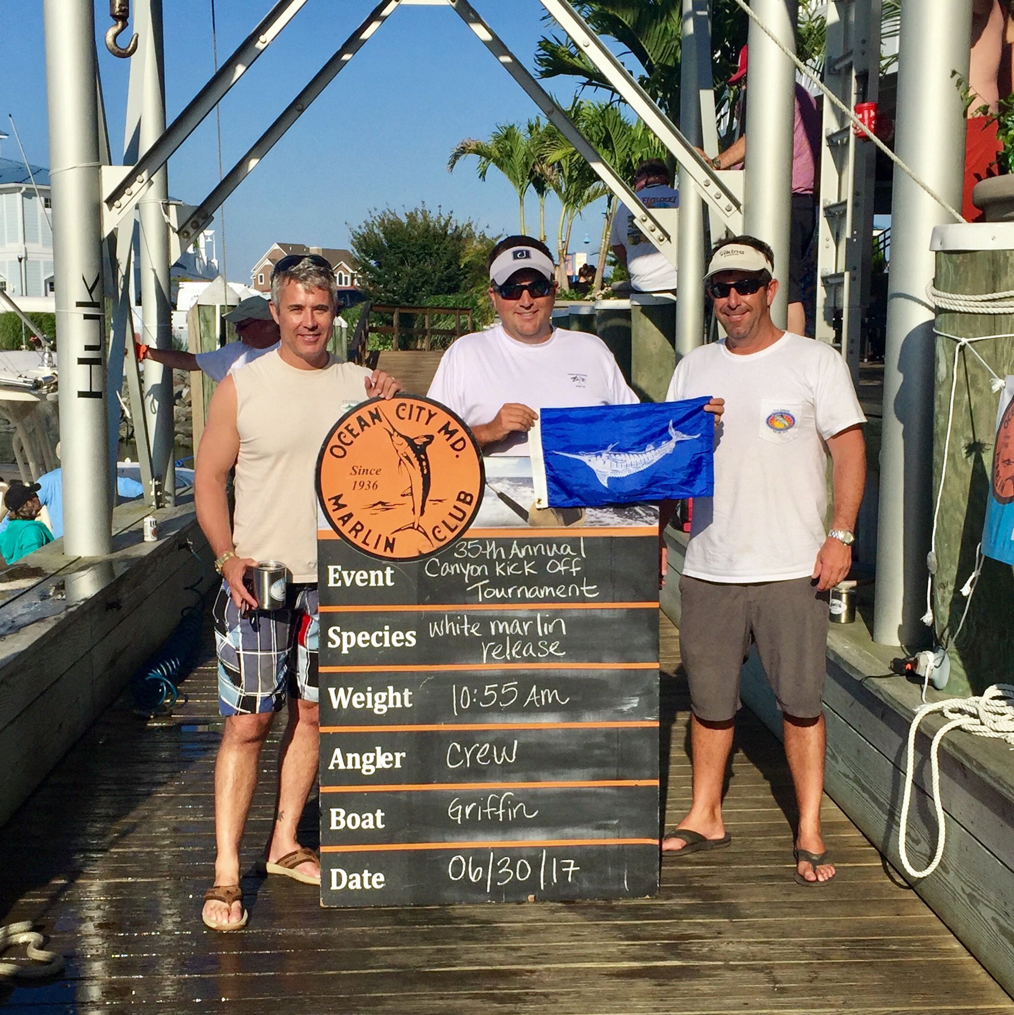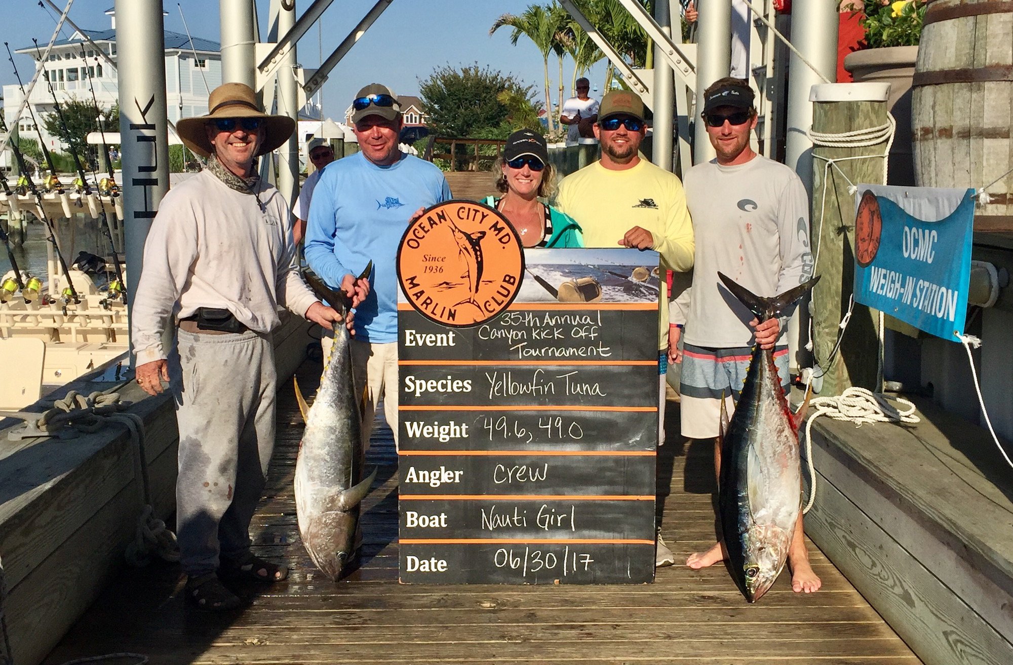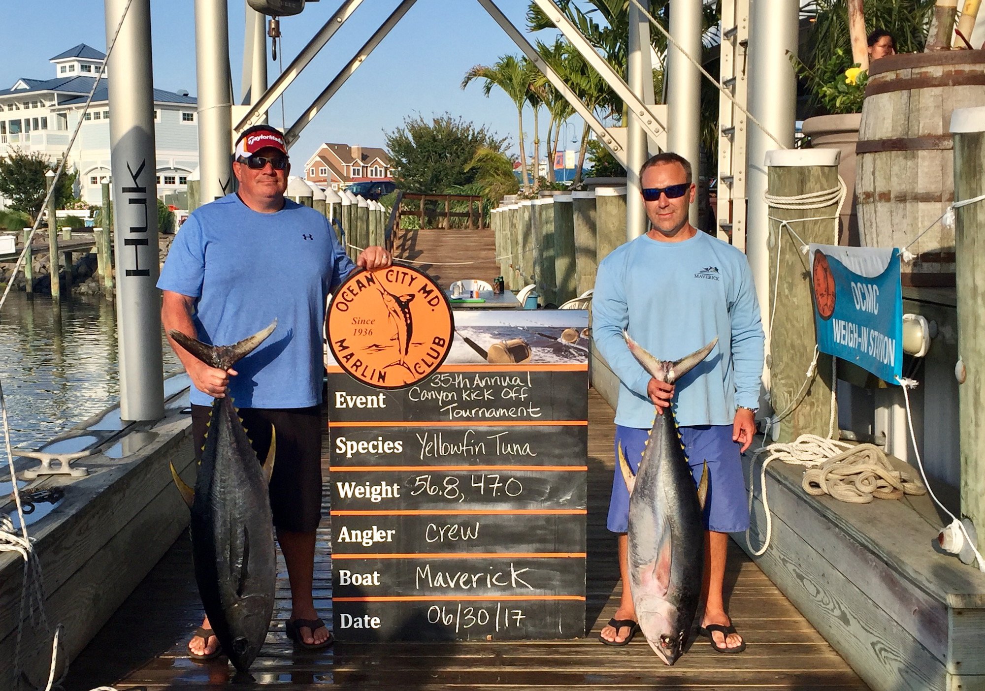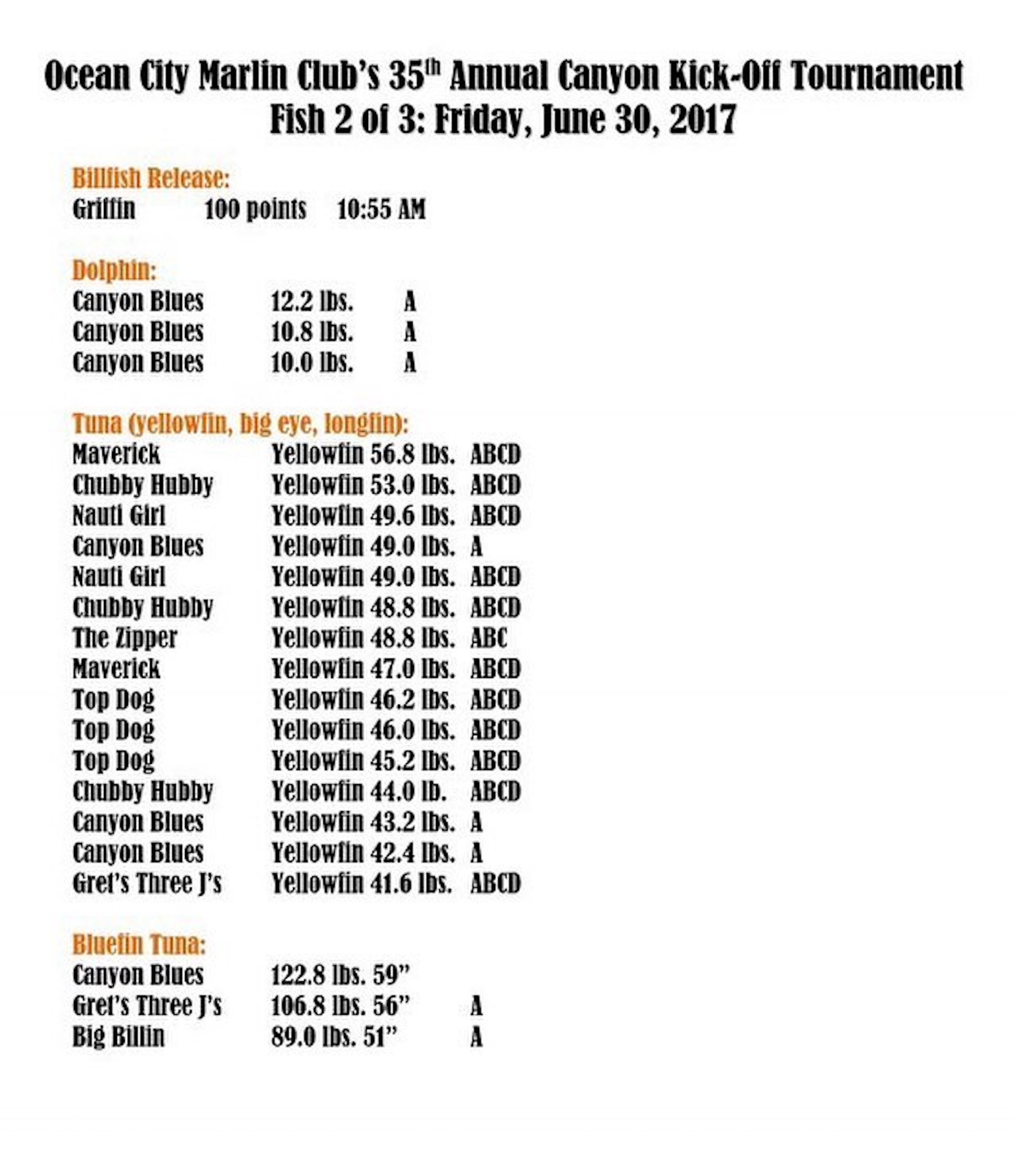 Today was day one of the Ocean City Marlin Club’s Canyon Kick Off tournament with scales action at Sunset Marina. There are 64 boats fishing this year’s event and only 17 of them decided to fish one of their two days of fishing today. It was a busy day at the scales considering the limited number of boats. Here’s what the leader board looks like after one day of fishing. Thanks to Amanda Shick for the pics!