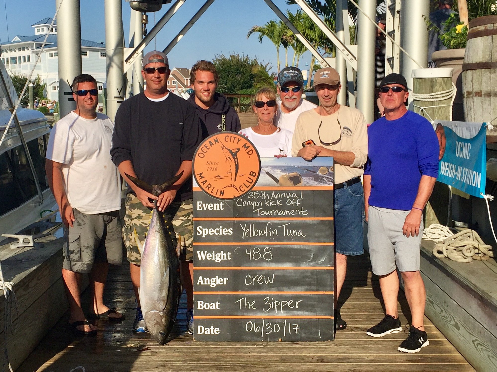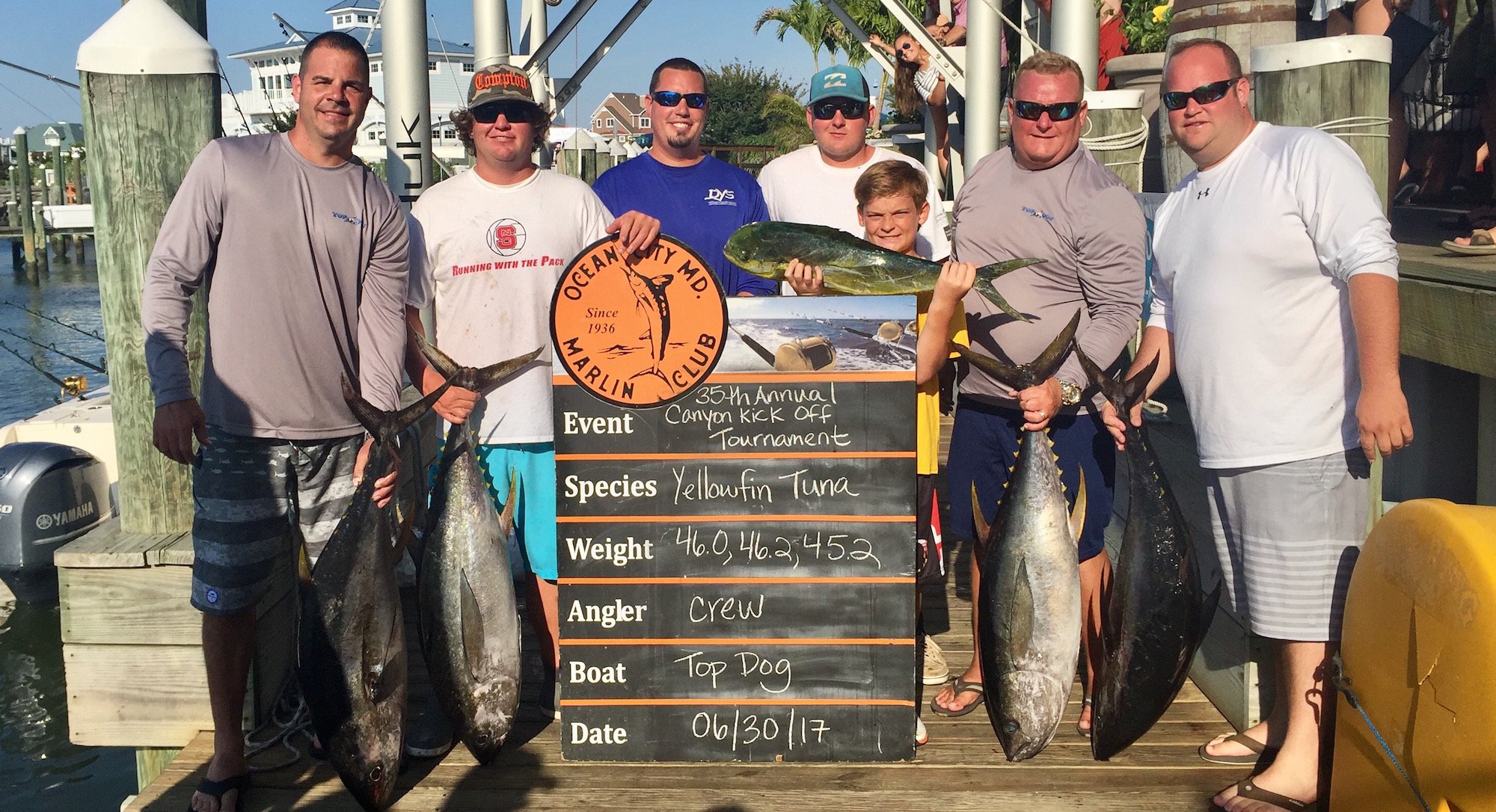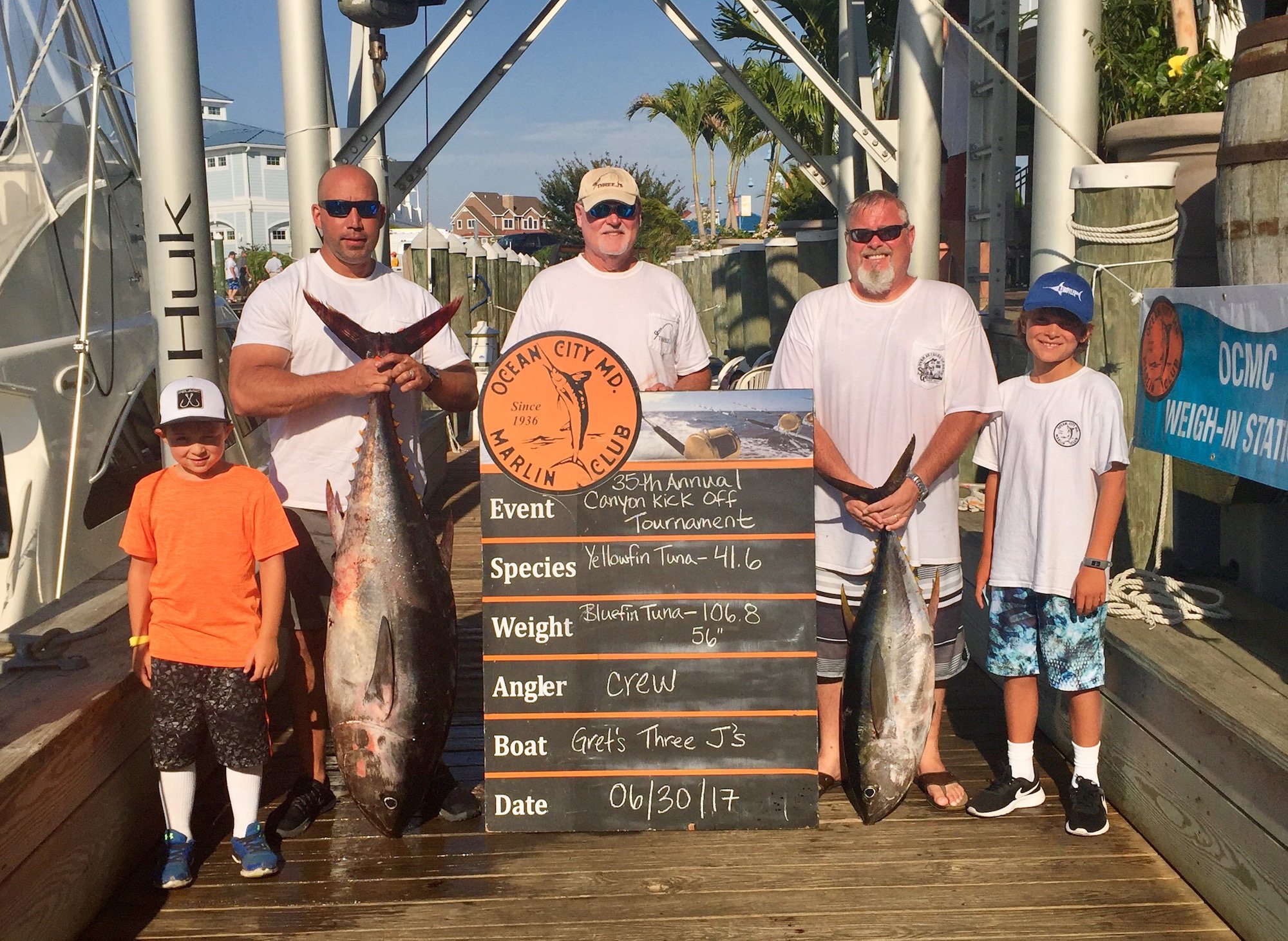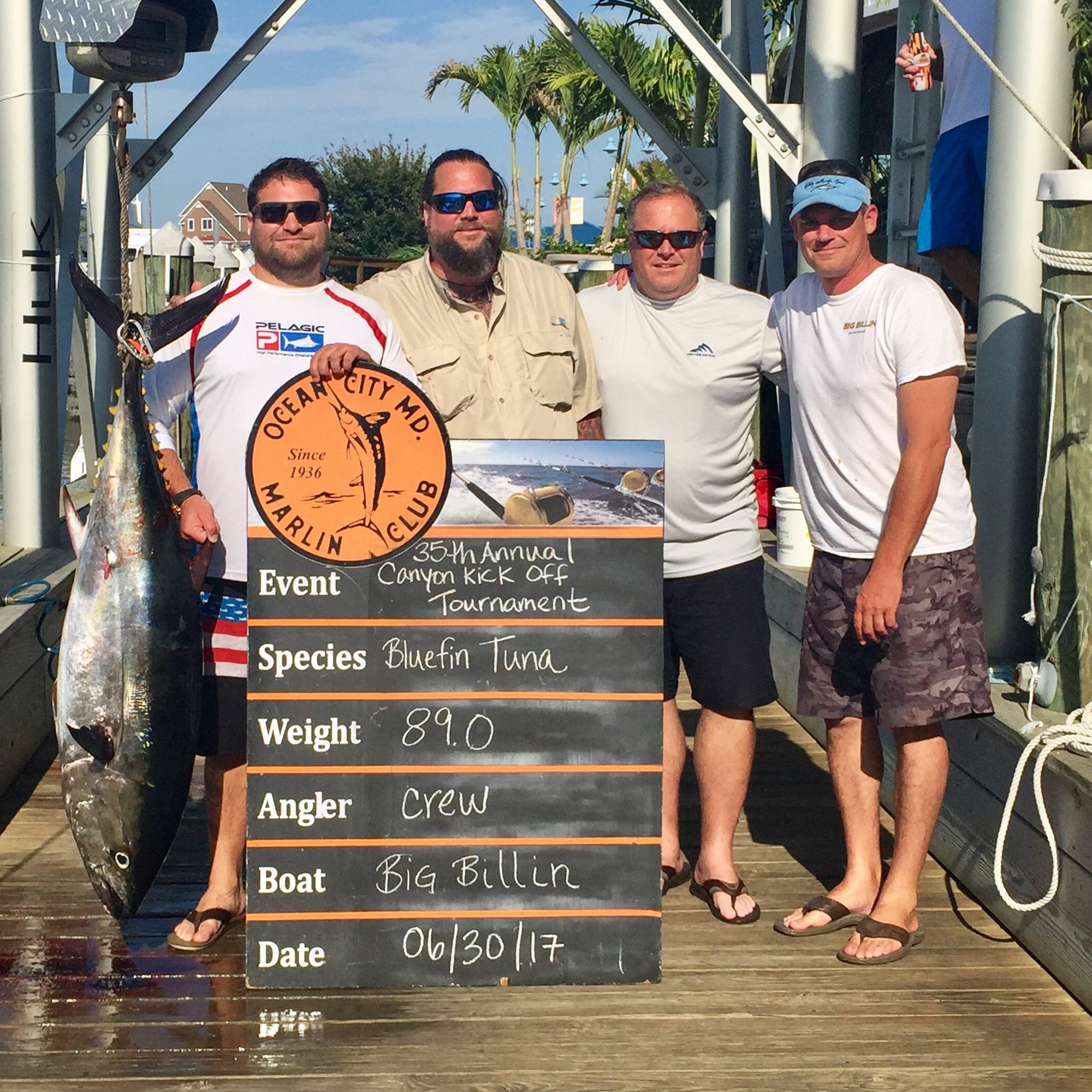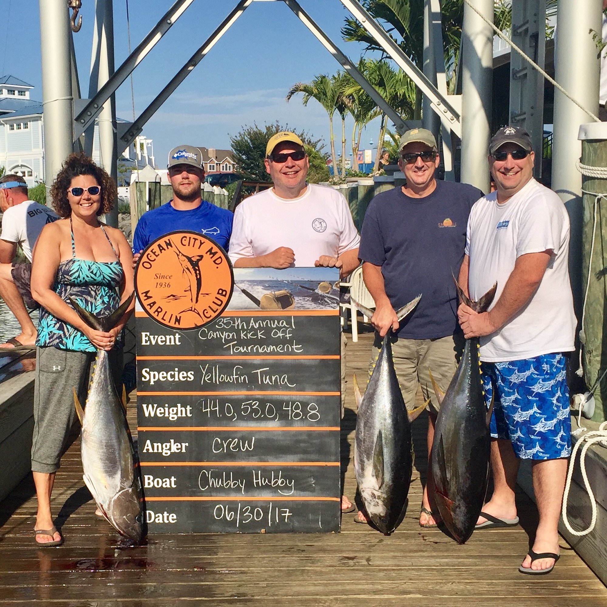 Today was day one of the Ocean City Marlin Club’s Canyon Kick Off tournament with scales action at Sunset Marina. There are 64 boats fishing this year’s event and only 17 of them decided to fish one of their two days of fishing today. It was a busy day at the scales considering the limited number of boats. Here’s what the leader board looks like after one day of fishing. Thanks to Amanda Shick for the pics!