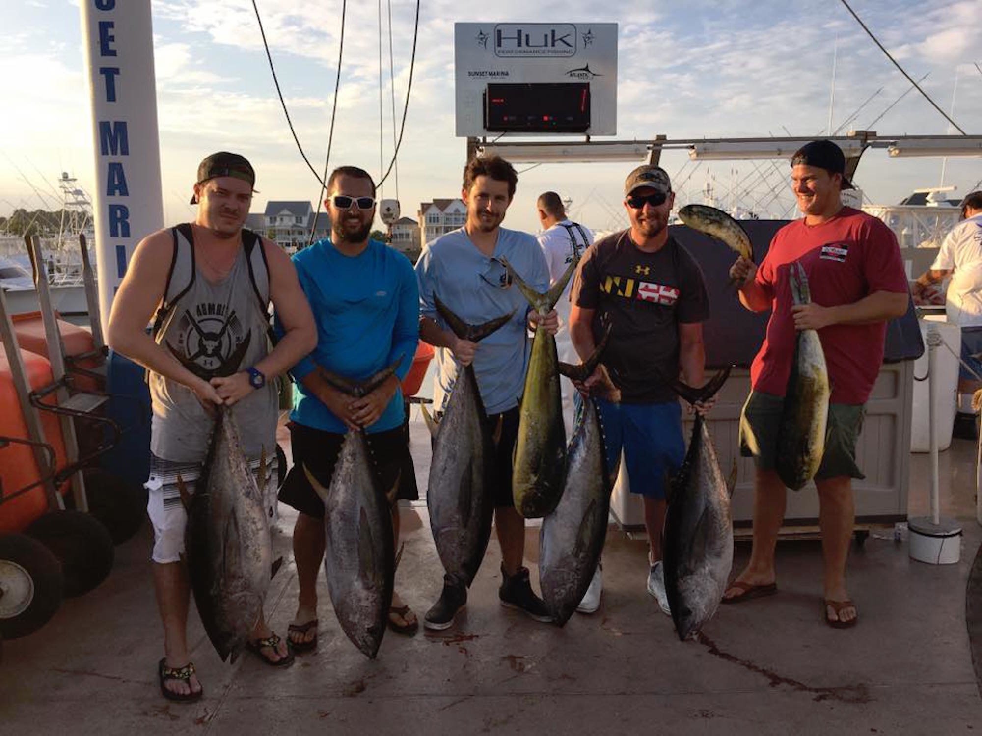 The crew of the private boat Tuna Fowl with Josh Ensor and the boys out of Sunset Marina had a good day of fishing today boxing five yellowfin tuna and two gaffer mahi.