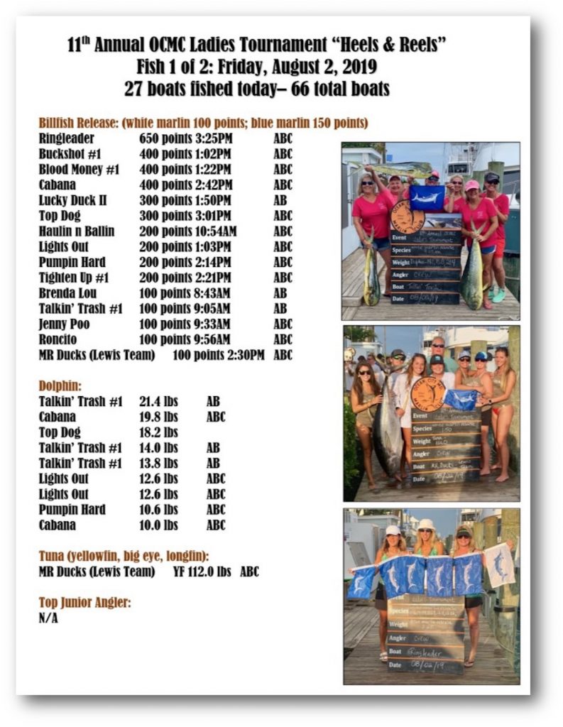 Today was day one of the Ocean City Marlin Club’s Heels & Reels ladies billfish tournament and it was a terrific day at the scales. The ladies get to show us how it’s done in this one and some crews use it as a scouting mission for next week’s White Marlin Open. Well based on today’s fishing from the girls fishing is looking up! Thanks to Amanda Shick for always keeping me abreast of things.