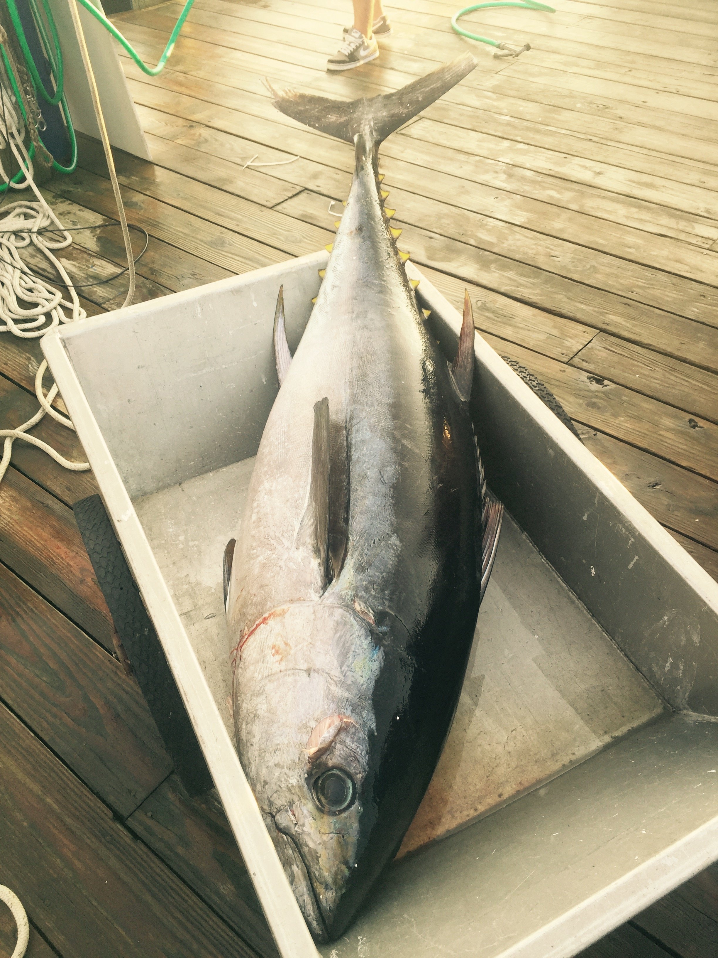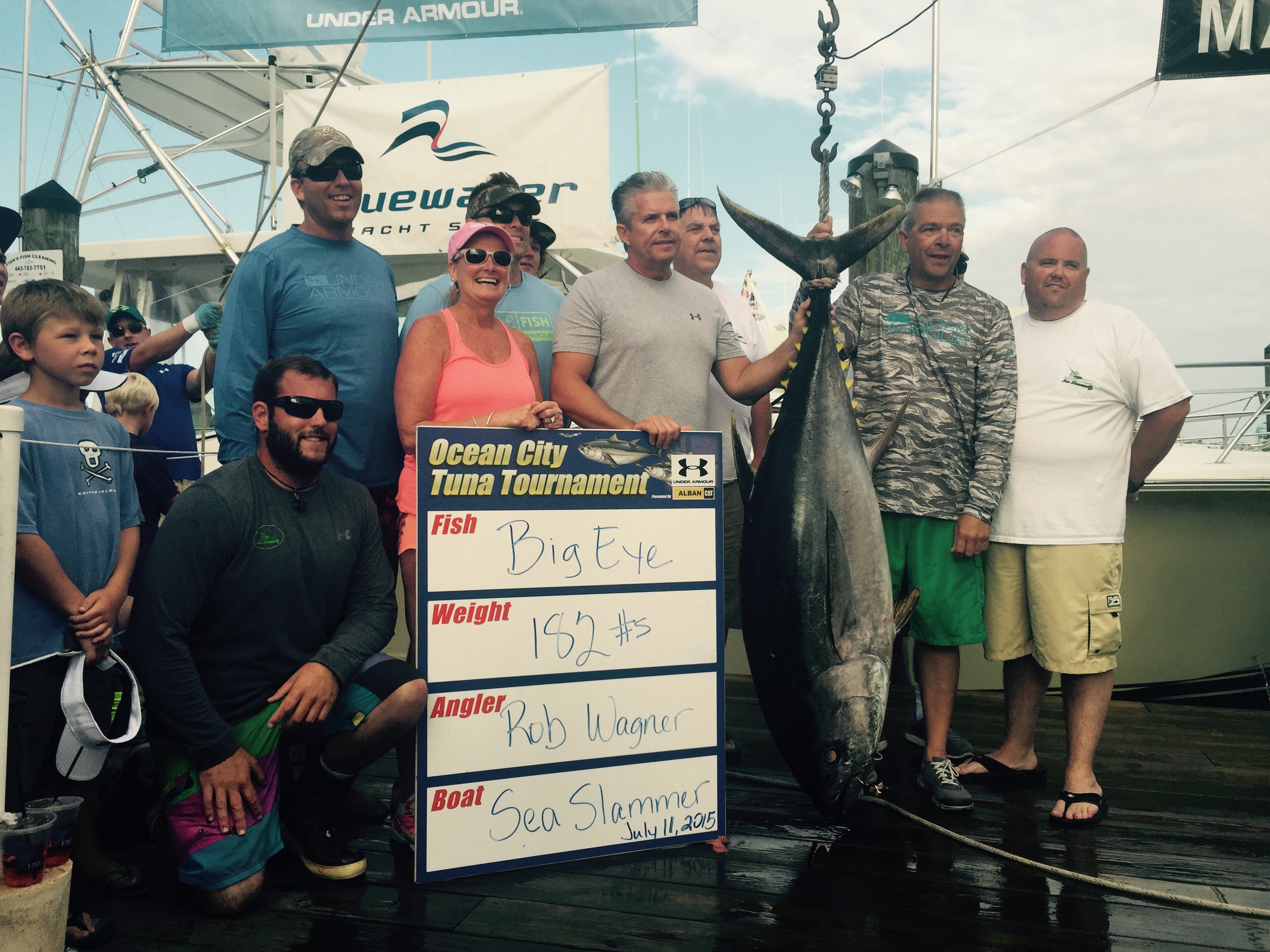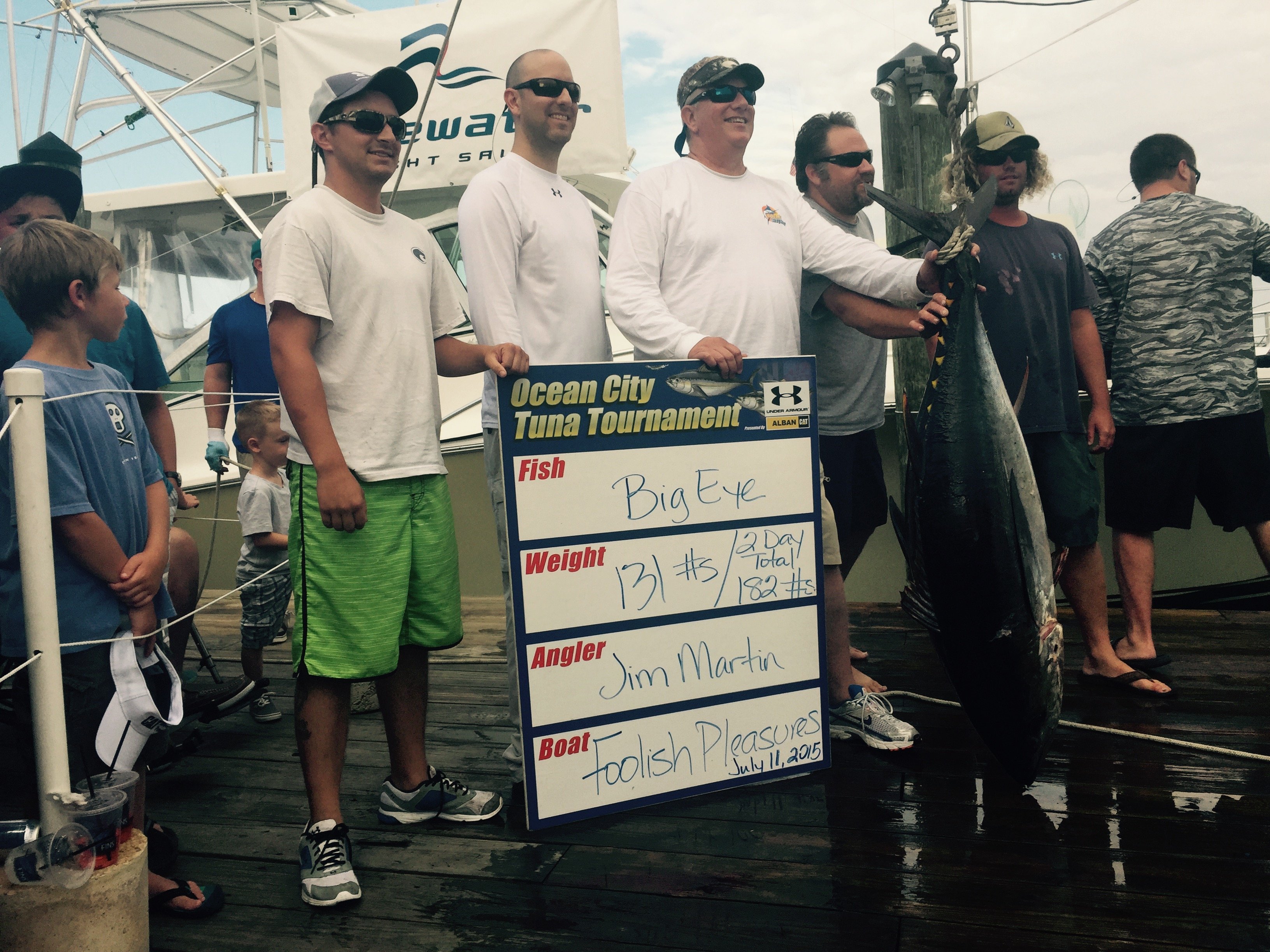 Day two of the Ocean City Fishing Center’s 28th Annual Ocean City Tuna Tournament is in the books and there was some changing of the leader board happening at the scales tonight. Overall the fishing was slower today with 70 boats fishing than it was yesterday when only 34 boats fished. I spoke to several captains that caught nice bigeye tuna today and they said that it was their only bite of the entire day. I’m a big proponent of the theory that when the ocean is too calm and/or there are too many boats fishing in a small area that fish like tuna get spooked and don’t bite as readily. Today both of those scenarios were in place. The ocean was flat calm for most of the day, and there were A LOT of boats fishing because it was a nice calm Saturday. That theory seemed to be a reality today as fishing was slower, but we did see some action at the scales tonight.