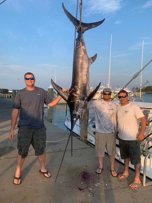 The other day Adam and Corey Lindstrom and Chris Petrova caught this 215 pound swordfish while fishing on the private boat Dirty Money.