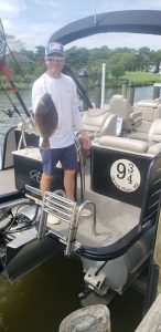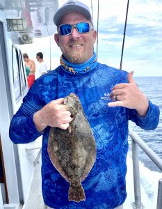 Svend Sheppard used the Fish in OC Dale Timmons’ Deadly Double in chartreuse with a white Gulp to put this 17″ keeper flounder on the platform.