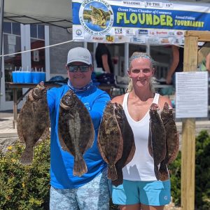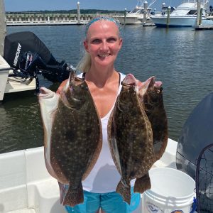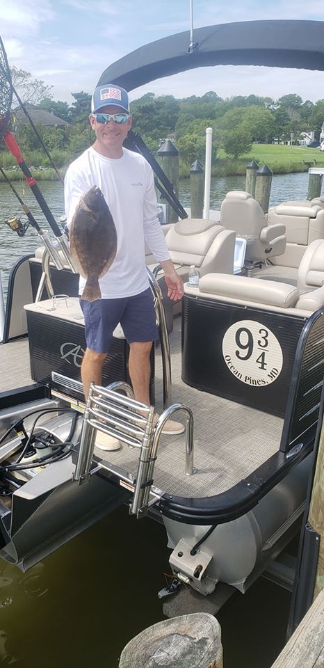 It was a hot one again today, and the bay was packed with boats and jet skis…some of which quite literally yelled to me, “we have no idea what we’re doing!” That made it tough for flounder fishers like me and my wife Kristen who were trying to put a hook in a flounder that could win the Ocean Pines Chamber of Commerce Flounder Tournament. Despite the crowd there was some reely good fishing for flounder on the high tide this morning and my lovely wife had a milestone day when she limited out on keepers. I added a couple myself for a total of 6 and though we didn’t stay on the leaderboard, we did have an awesome day on the water and I was proud of Kristen for catching her first ever limit. We used the Fish in OC Doormat Destroyer today because we had some live “peanut” bunker and they worked like a charm.