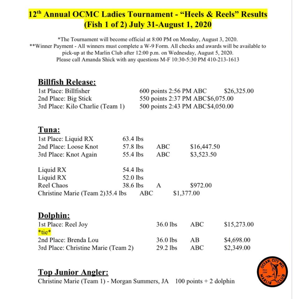 Today was the 2nd and final day of the Ocean City Marlin Club’s Heels & Reels Ladies Tournament and the ladies absolutely killed it again. Big thanks to Amanda Shick of the OCMC for the pics and the results! Congratulations to all of the winners!!