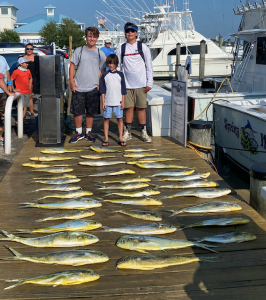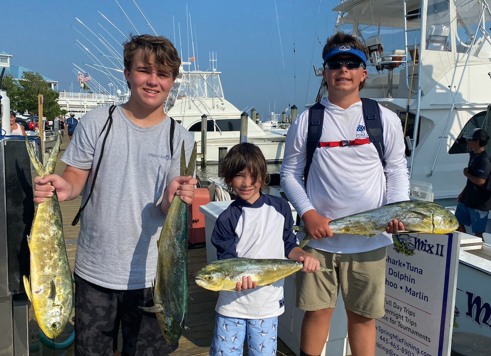 My son Ryan and I had the pleasure of fishing on board the Spring Mix II today with Captain Chris Watkowski and mates Ayrton Pryor and Jacob Bialk for the Kid’s Classic and Ryan was joined by fellow teammates Owen West and Christian Watkowkski. The billfish and tunas eluded us, but the kids did a great job putting 37 mahi in the boat and they got to see something they may never see again when we were up close and personal with a huge whale shark. The big whale shark was just feet from the boat and was 30+ feet long. Very impressive to say the least. I can’t wait to see the video in an upcoming episode of Hooked on OC!