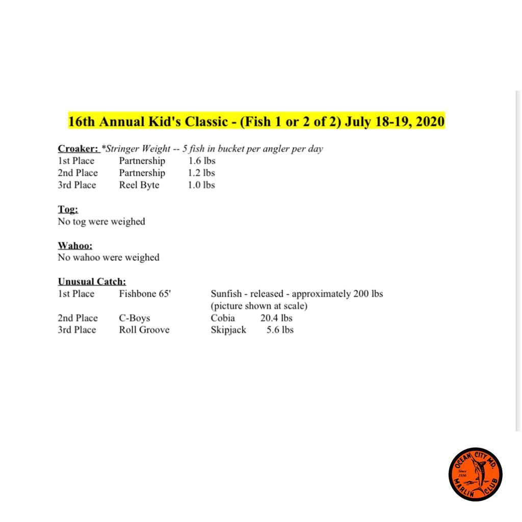 We didn’t have anything to weigh for the Kid’s Classic, but lots of teams did. It was a great event and the Ocean City Marlin Club did a tremendous job. Kudos to Amanda Shick for running such a wonderful event that had over 220 participants. Thanks to Amanda and Dave Messick for the pics! Here’s who won what.