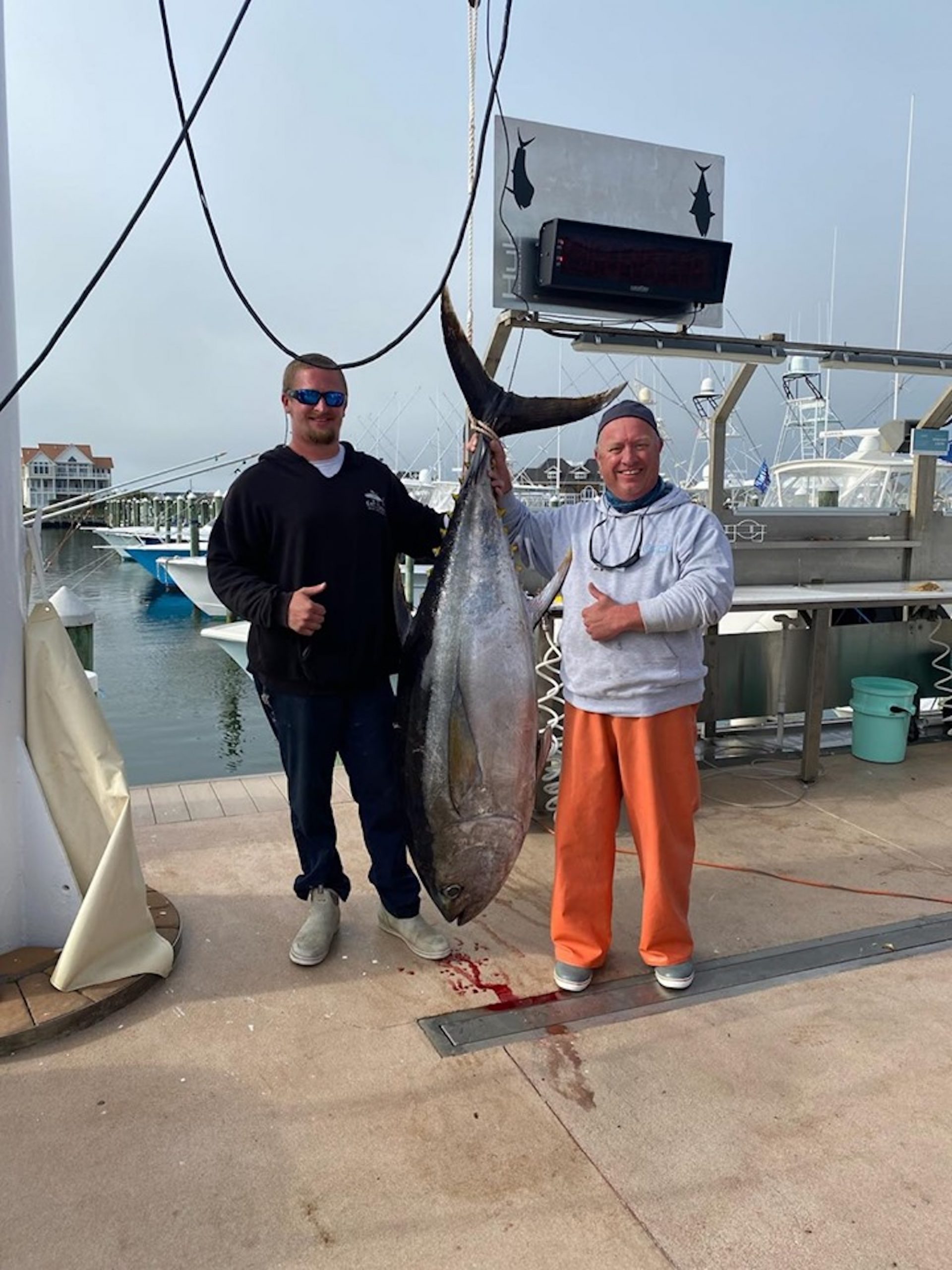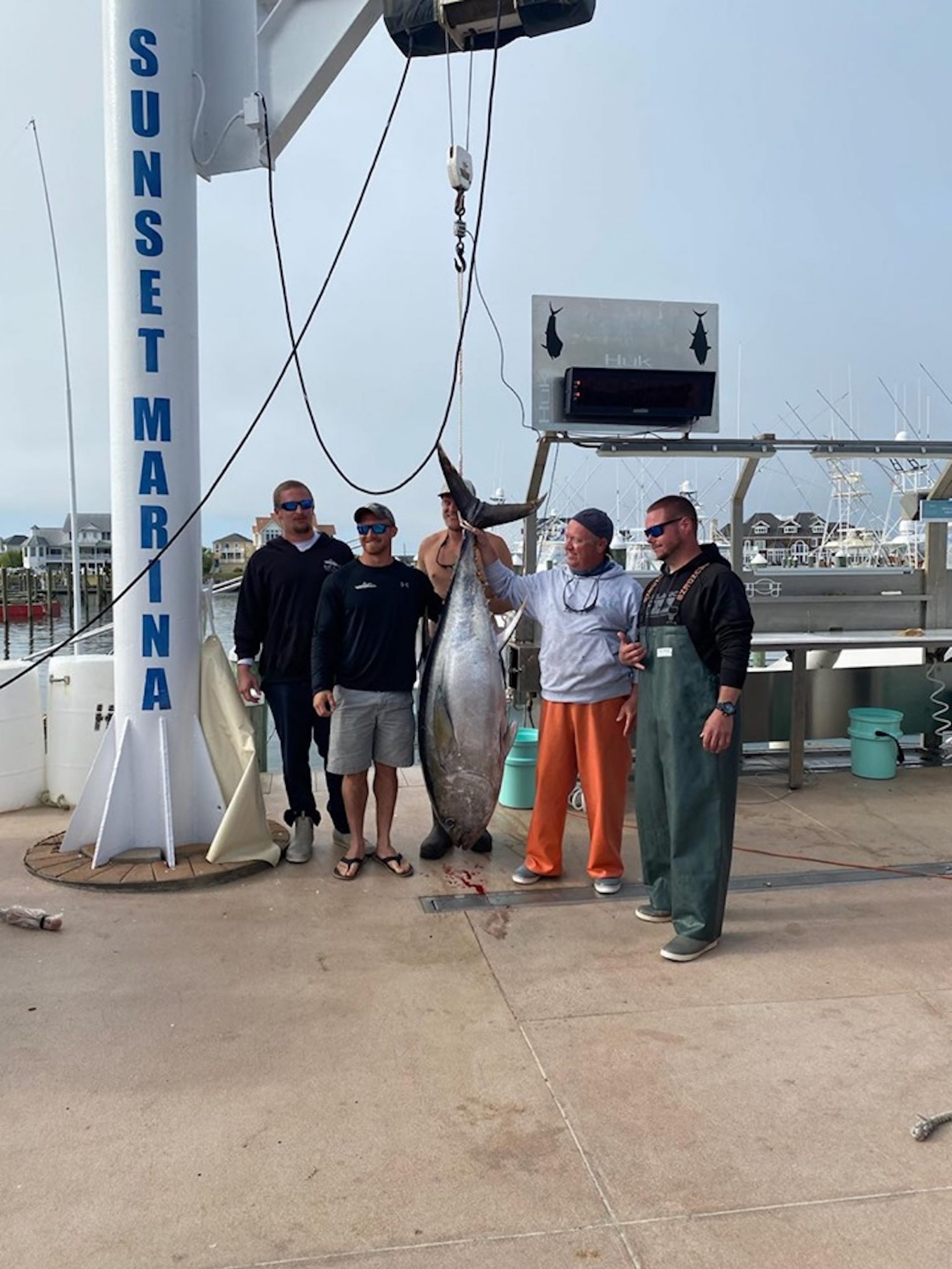 The tuna fish are pretty far to our south in the Norfolk Canyon, but for some boats it is worth the ride to try and put some meat in the freezer. Today Captain Brendan Barbey with his dad Jim Barbey, Jeff Rosenkilde, Ryan Turner and Todd Sauerwald fished the Norfolk and were rewarded with the first bigeye tuna of the season out of Ocean City. Jeff reported that the fish was hooked just 30 minutes into trolling and took 2 hours to get to the boat. When the big “eyeball” hit the scale at Sunset Marina this afternoon it tipped out at 213 pounds and had the crew all smiles. The guys also had another bigeye hooked for a short time and pulled the hook.