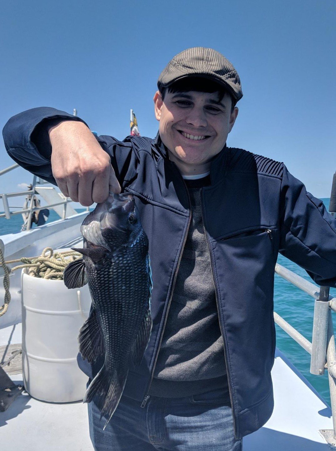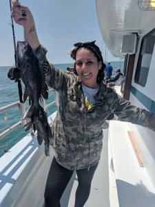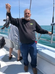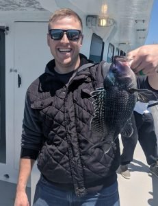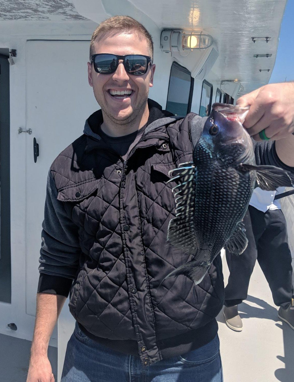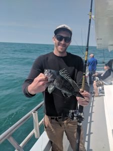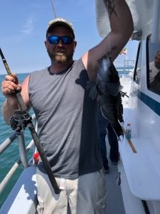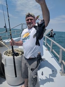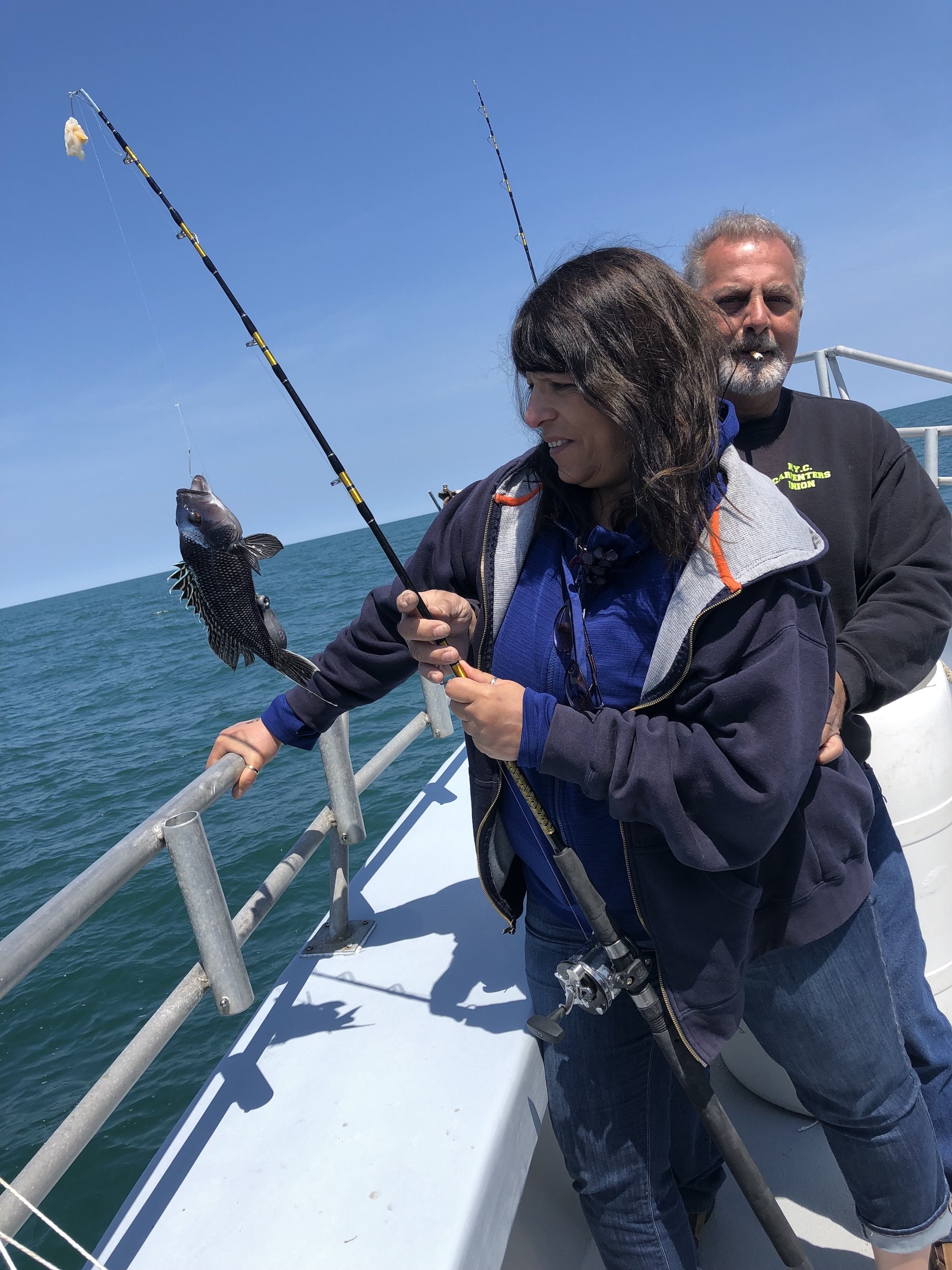 Captain John Bunting on the Judith M found the sea bass again on Saturday of this weekend. Captain John put his crew on about 150 sea bass with about 1/2 being keepers in the 14″ to 16″ range. Pictured are Dan Day (York PA) Dominica Bavino (Troy NY) Troy Testo (Troy NY) John Godino (Newburgh NY) Adam Alitzer (Federalsburg, MD) Maryann Groff (Newburgh NY) Kyle Muse (Las Vegas NV) Sean Rowlands (Tucson, AZ) and mate Max Thurma (Ocean City MD) with a pollock and a sea bass.