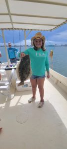 This young lady landed herself a big 23″ flounder while fishing with Captain Jason Mumford of Lucky Break Charters today.