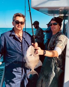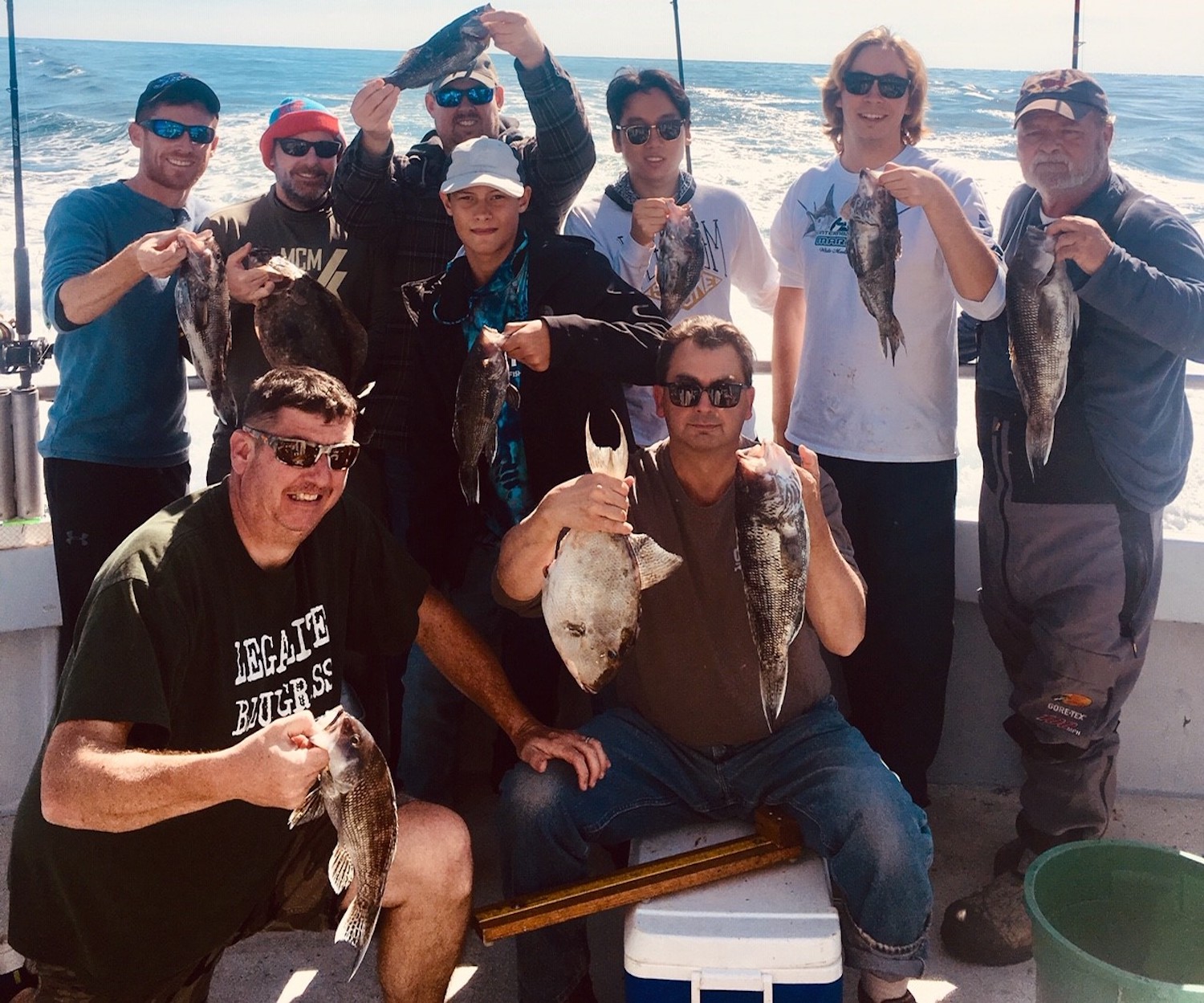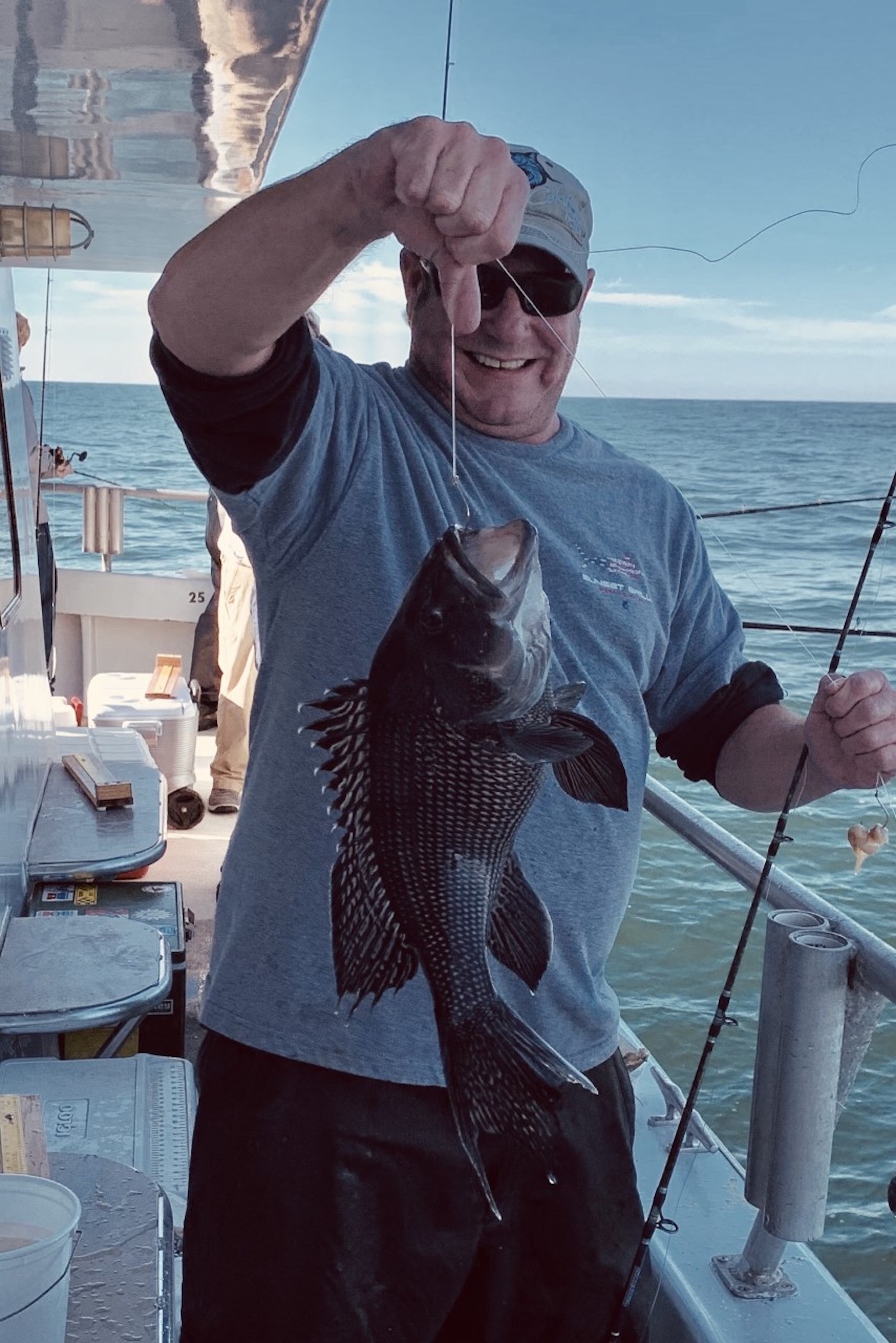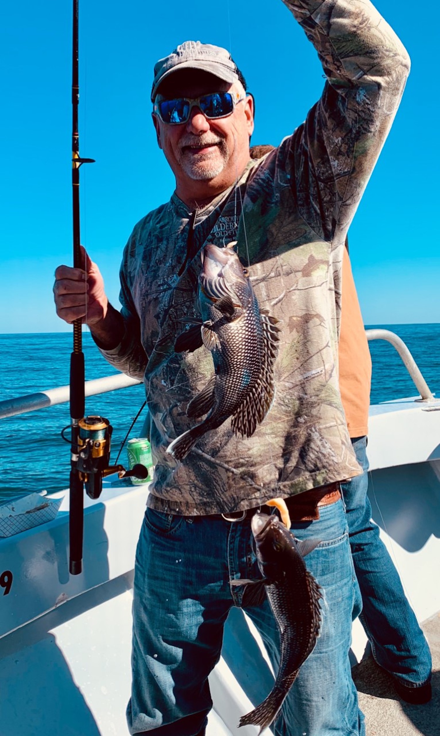 Chuck Burnham, here with a nice triggerfish & mate Capt. Jeff Nottingham (Jeff was found at 1-800-RentAMate because mate Jonah snuck down to Hatteras for the weekend) ..Chuck was first across the limit line today with 15 nice cbass. Many other clients followed suit. (The ones who didn’t just didn’t want that many!)