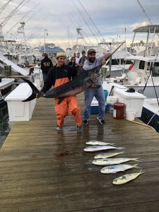 Offshore fishing was reely good for meatfish today with several boats landing tuna, wahoo, mahi and swordfish.  The Fish On with Captain Andrew Dotterweich had a great day putting some mahi and a 128 pound swordfish on the dock.