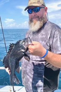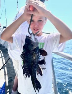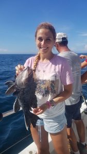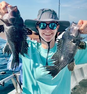 Young miss Alexis of Phoenixville PA dropped our reef blocks at Capt. Bob Gowar’s Reef (perhaps aided by a mate?) this morning. She also proved adept at reeling in some nice ones.