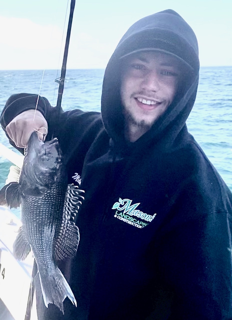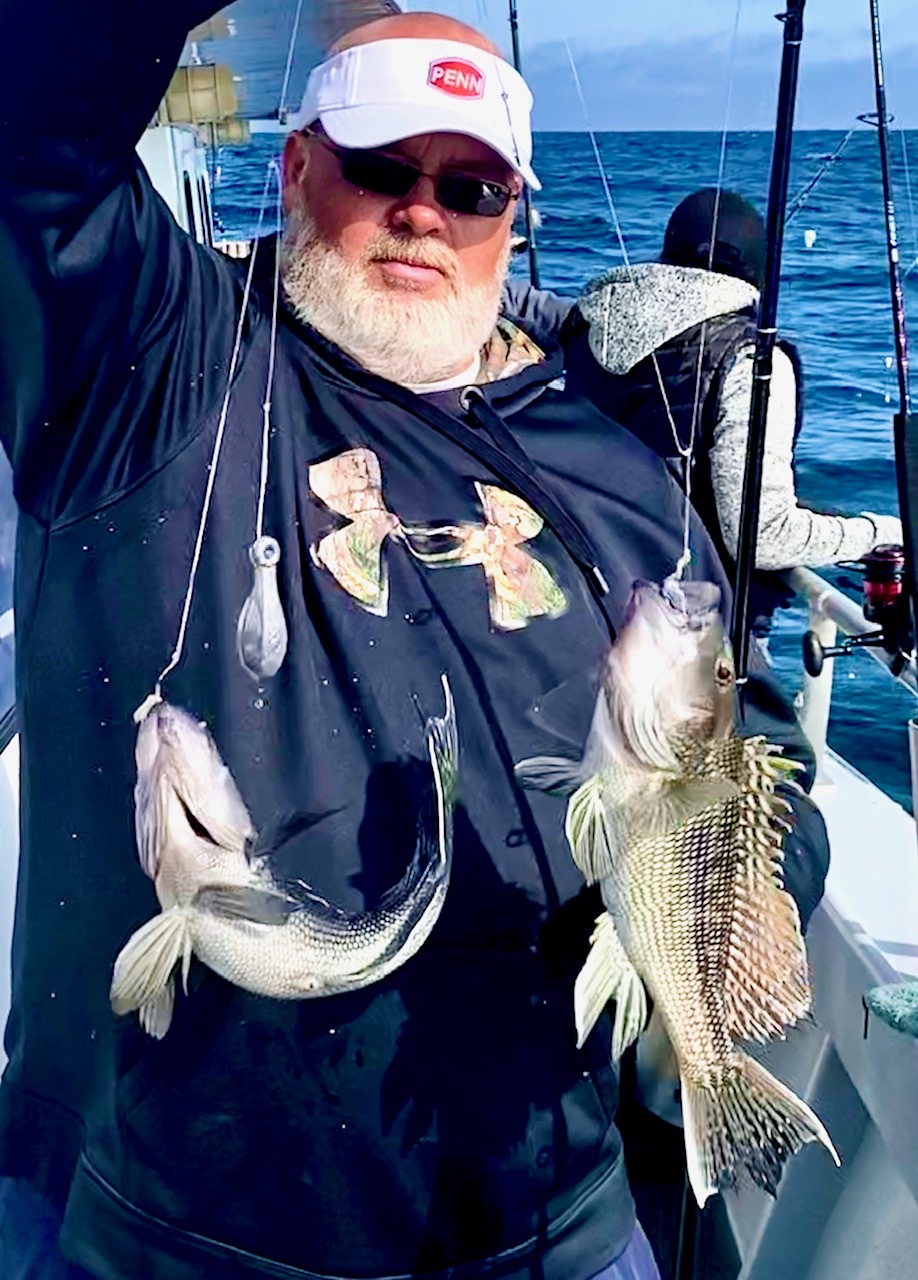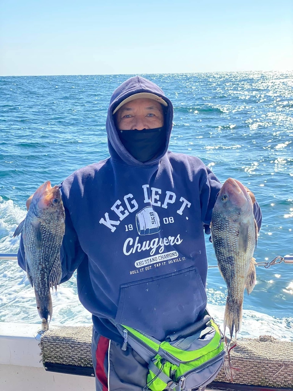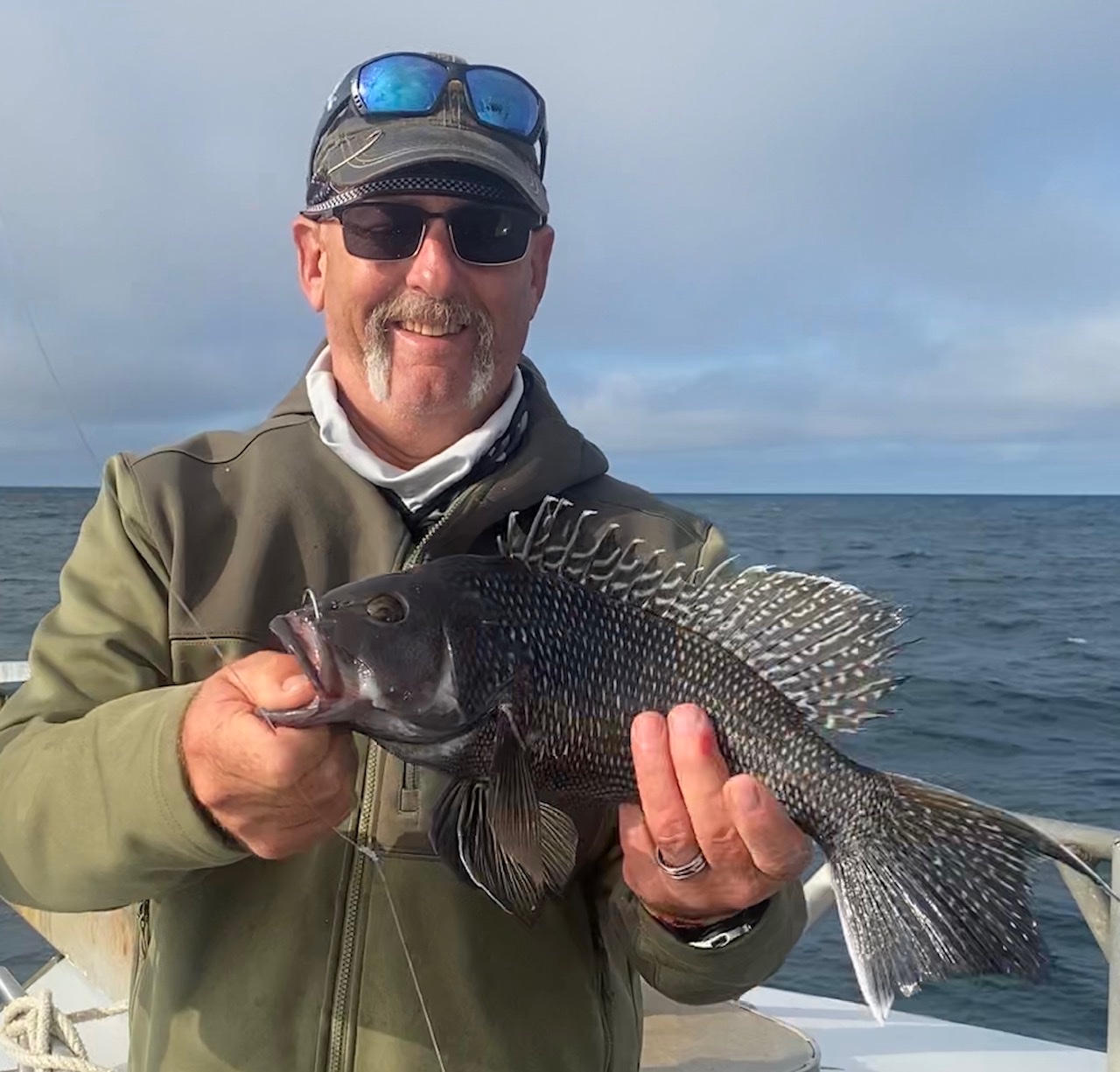 Captain Chase Eberle of Chasin’ Tides Charters caught his crew so many sea bass that he had to break out the snow shovel today.