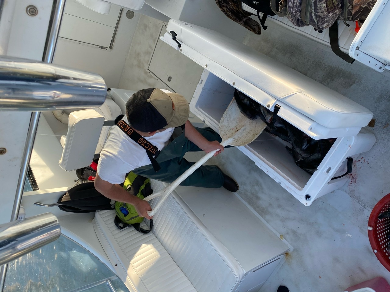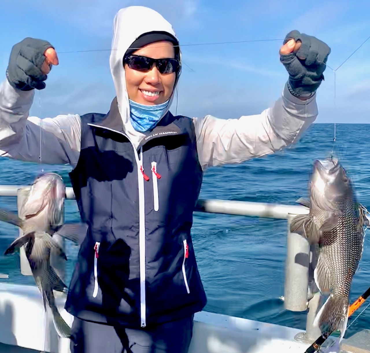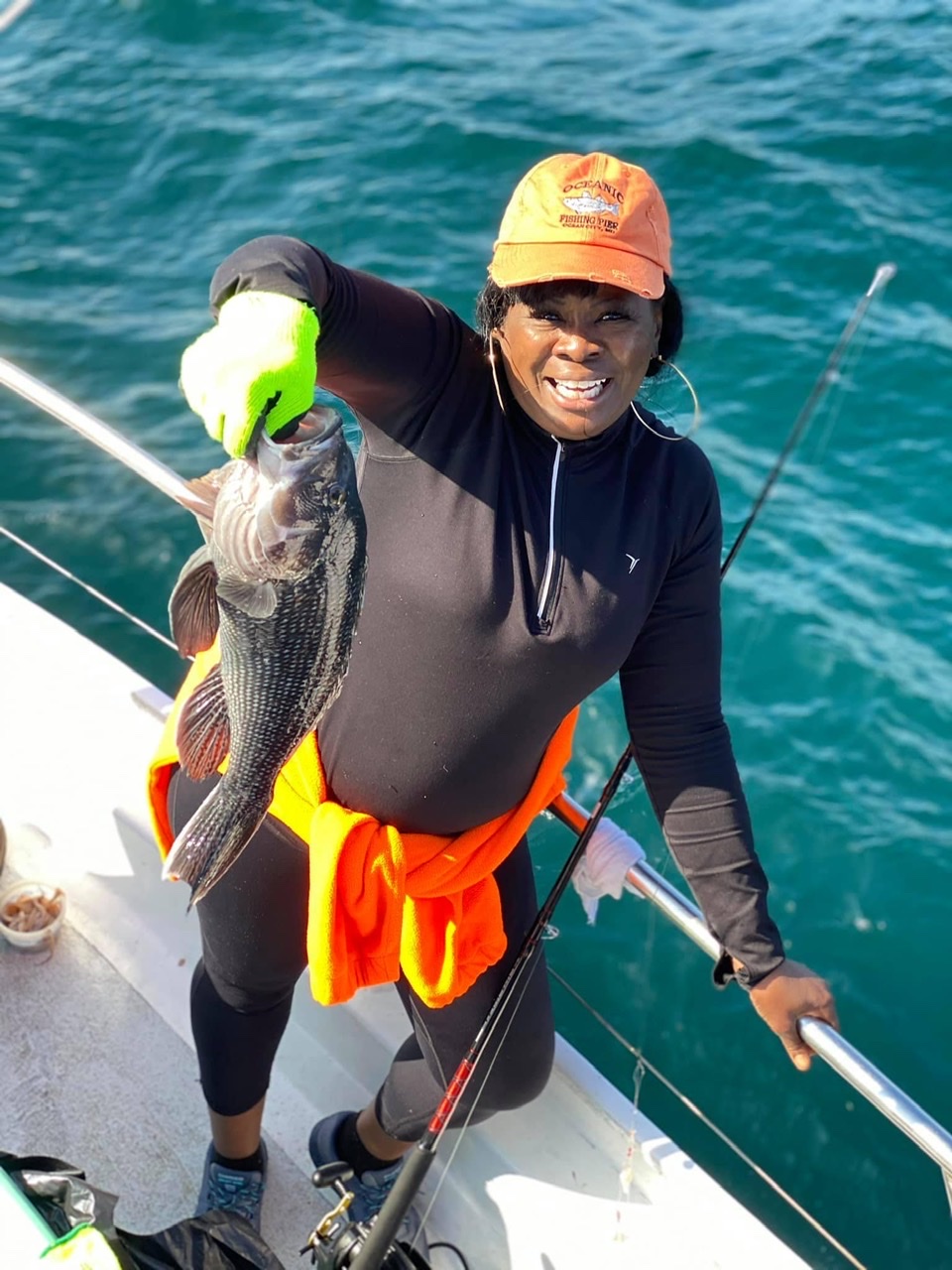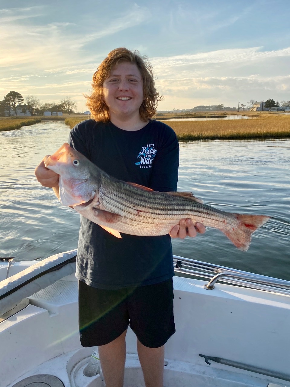 Captain Chase Eberle of Chasin’ Tides Charters caught his crew so many sea bass that he had to break out the snow shovel today.