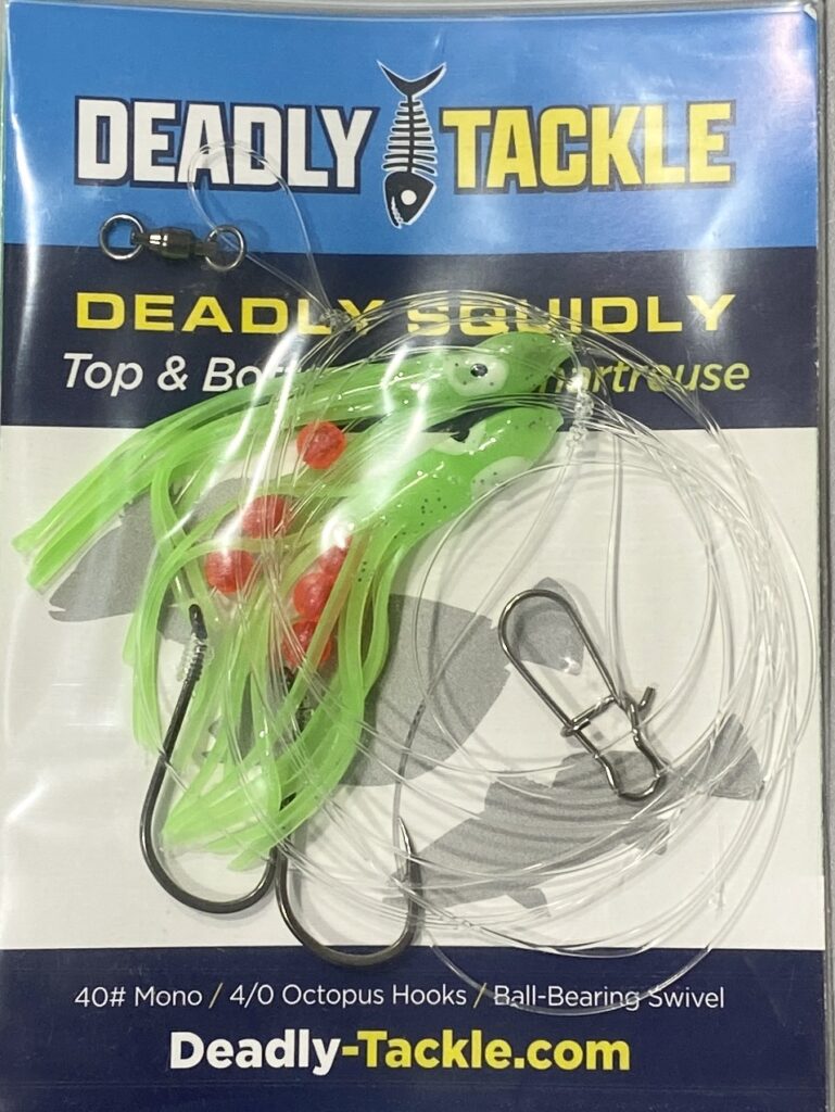 40# monofilament, two 4/0 live bait hooks, two chartreuse squid skirts, beads, sinker snap, barrel swivel.