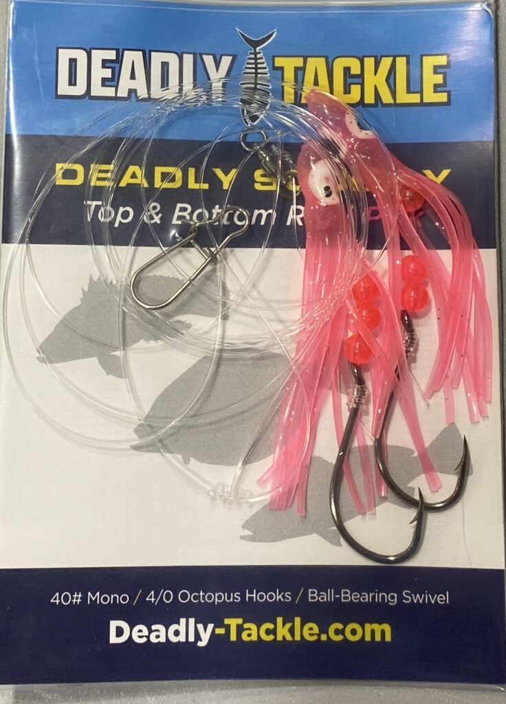 40# monofilament, two 4/0 live bait hooks, two pink squid skirts, beads, sinker snap, barrel swivel.