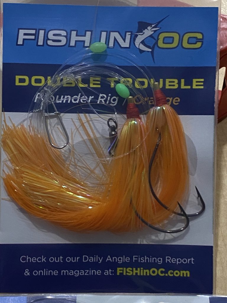 The ” Double Trouble” is designed by Dale Timmons and is a variation of the basic top and bottom, or “high low” rig. It is tied from one piece of mono with a short leadered top hook and a bottom hook with a relatively long leader. The “Double Trouble” uses classic wide gap flounder hooks that are perfect for shiners, live minnows or “Gulp” swimming mullet in r 4 or 5 inch. The rig works well when your are drifting or slow trolling and the colored skirts are an added attractant to summer flounder that feed on sight.