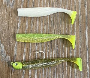 1/2 ounce glow green head with 3.75″ “killer minnow” shad.