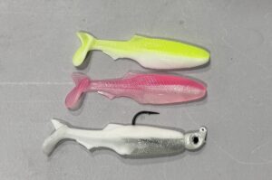 1/2 ounce white head with 4″ white/ salt & pepper shad.