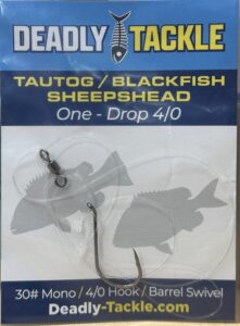 This rig works well for tautog/blackish, sheepshead, sea bass and other fish that frequent structure. Bait the hook with sand fleas, shrimp, crab or clam.