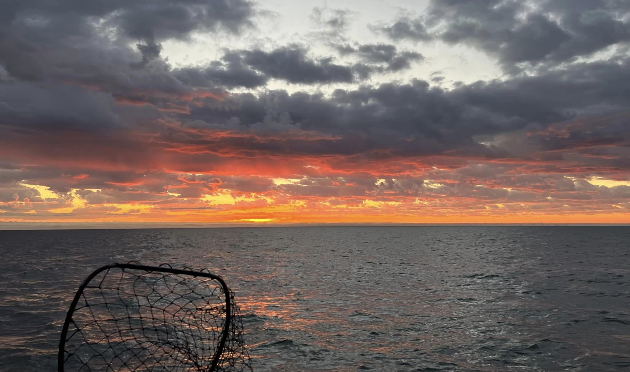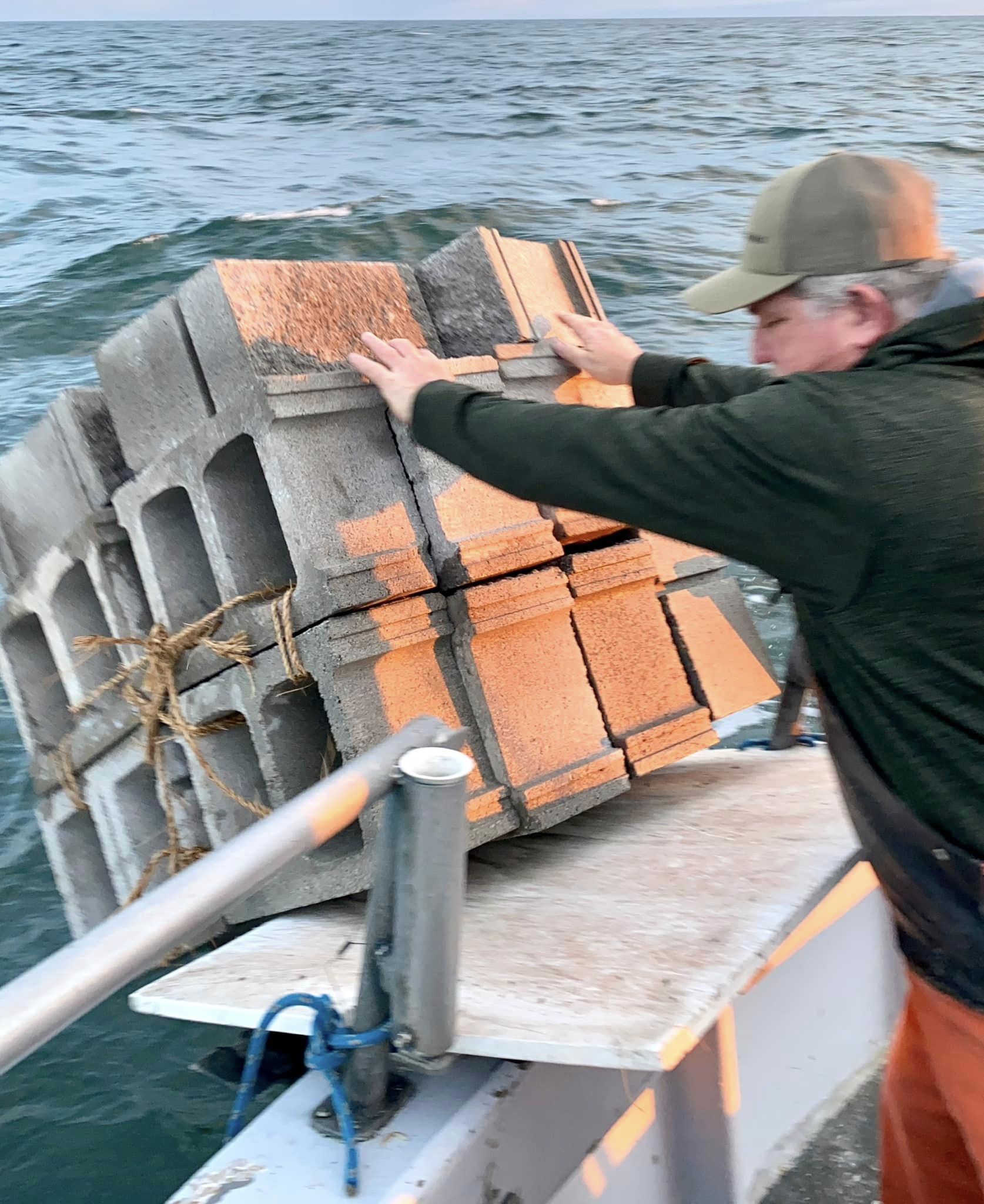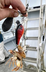 Art that’s different every day and across the grandest canvas imaginable; we caught a fabulous sunrise this morning. Snuck out a short ways considering the forecast. I don’t trust anything with ‘north’ in it. Did puff up later but was not too bad. Doug gave today’s reef blocks a shove at Capt Bob Gowar’s Memorial Reef & Max won the pool.. Perseverance was a necessity today. The day’s fishing began dead as a hammer; was a long time improving. By afternoon we had at least a bit of a bite going. Tagged some nice females too. For a while I had a mate in DEEP doodoo after dropping a tog that would have won the pool through a scupper. Oyyyy! All’s well that ends well? They managed to catch one bigger and kept todays pool money in the family. Now, as I advise in every tog trip announcement – skunks are possible. Inevitable even. I’ll have a skilled client catch two dozen while another accomplished angler gets a donut hole. Had a keeper skunked client today, however, that was extra special. Vic had tied his tog rig up on the way out, no charge, with what we know will work. Fellow catches a 14.5 inch short (that he tried to keep – Fat Chance! – and got mad about that!) then cuts the boat rig off and ties several swivels on with a RatlTogTrap type of lure – and then puts crab on every hook. (Have a pic in the post that only shows one treble loaded with crab. Trust me, at one point they were all loaded.) He would NOT let the mates tie him another rig. He blamed the mates for his skunk (they did, after all, pitch one that “was only an 1/8 off your honor”) ..and swears he isn’t coming back. Darn. Hmmmm… I believe it was in 1994 I had a fellow complaining I hadn’t taken his party in the ocean – we were 40 miles out on a 90’ boat in a six foot swell catching sea bass like crazy. Well, everyone but him anyway. His rig was such a conglomeration—seven hooks, two wire leaders and a light kastmaster spoon for a sinker that I sincerely wanted to buy it – I wanted to frame it! Offered him money and all the bottom rigs he needed – but no sale. I wonder if it was the same guy. Will be announcing more tog trips soon. And yes, some — even amazingly skilled anglers sometimes — may well get a goose egg. Among the fisheries I have, nowhere is the old ABC Wide World of Sports intro more applicable – “The thrill of victory, and the agony of defeat!” describes these trips too well. (For those who remember – at least we’re not falling off a gigantic ski jump..) Looking for some more pretty weather.. Cheers!Monty