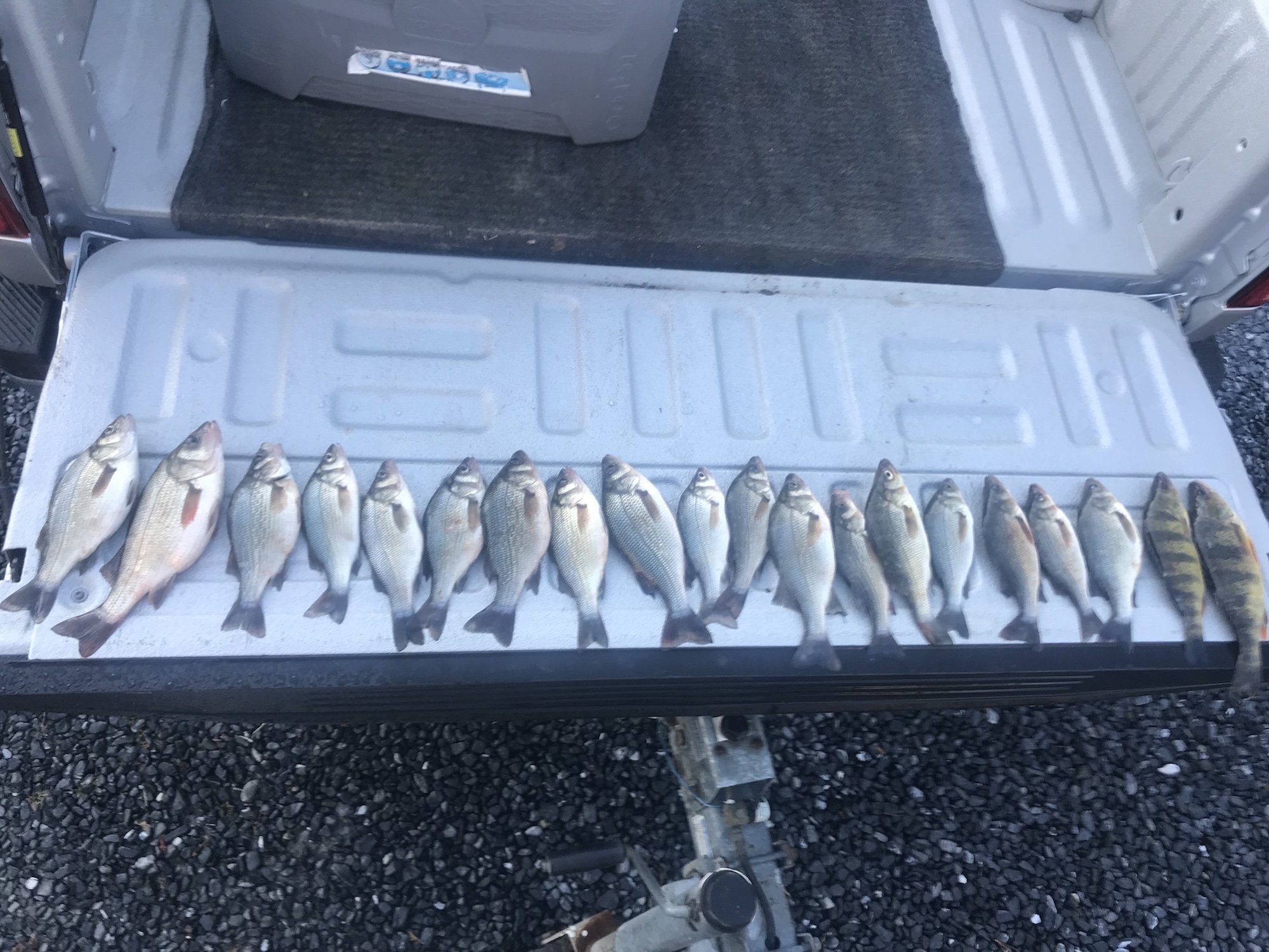 I still haven’t had a chance to get to the Nanticoke with my buddy Eric Sexton, but he’s not waiting for me and decided to give it a go on Sunday. Eric and Bennie Bennington found cooler water temps than their last trip at 45 degrees, but they still put some nice white perch and a couple of yellow perch in the cooler. Shown below in our redneck “fish on the tailgate” photo.