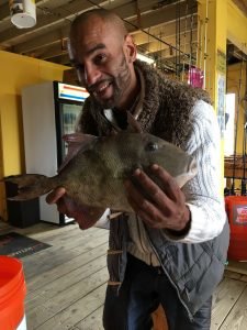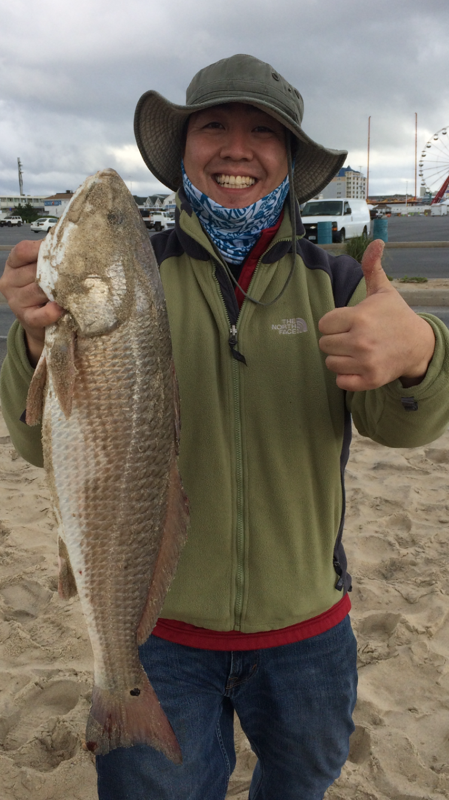 Bear at the Oceanic Pier sent me a few more shots this afternoon of anglers having luck downtown. Sung Lee from Germantown, MD used a live sand flea from the north sea wall to catch a 27″ red drum and Charles from Lancaster, PA used the pier’s live sand fleas to catch a 2 1/2 pound triggerfish from the route 50 bridge.