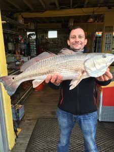 Anatoli returned to the pier just a short time later to have his picture taken by Bear with a nice keeper red drum caught on the same bait from the same spot.