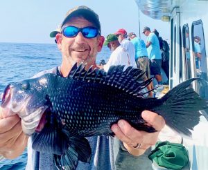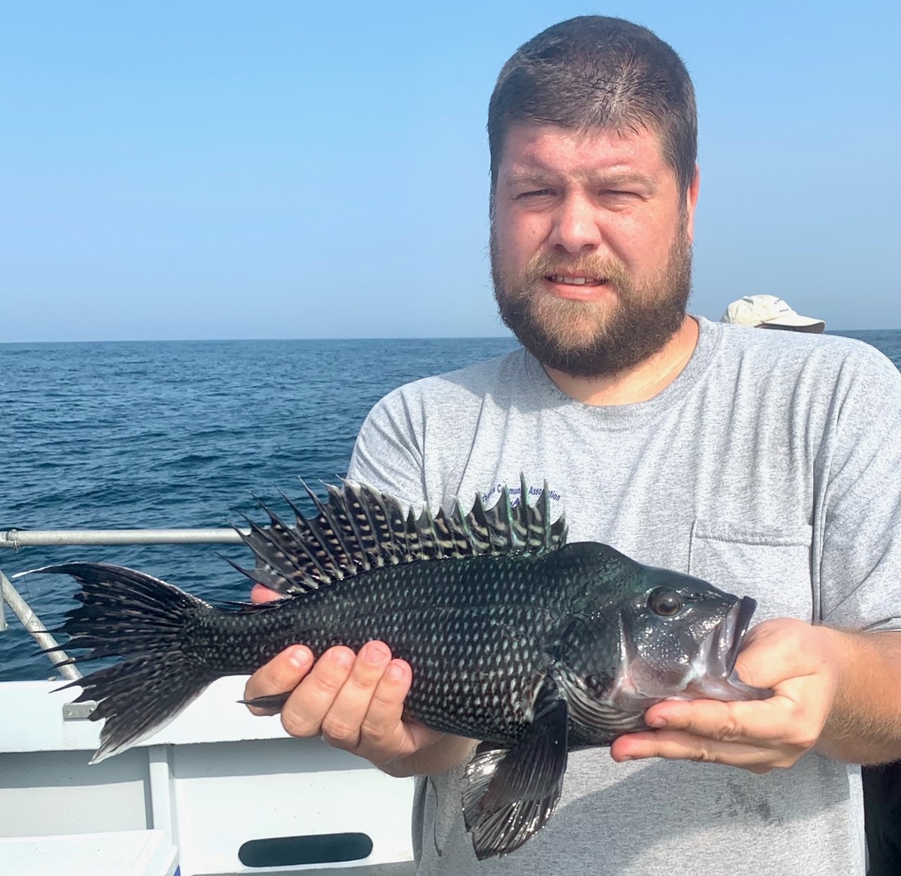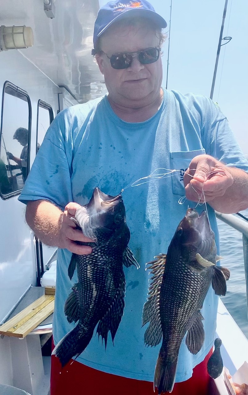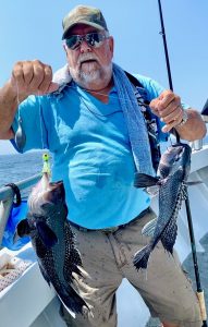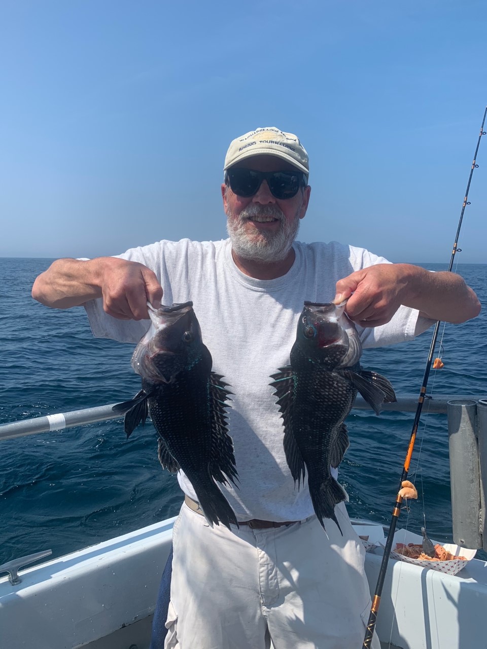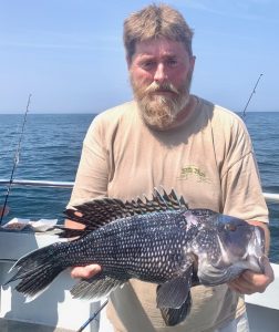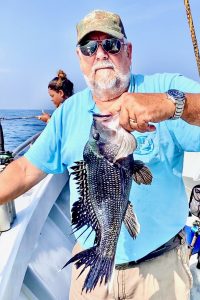 What a fine late summer day. What little of Henri we saw was gone – no swells remained; a light SW come NNW at not quite ten knots – perfect to cool clients on what might have been a burner. We lost 20 reef blocks to the sea and began fishing. Sea bass weren’t quite jumping in the boat, but they were biting. It was OK. There were a few real dandies in there too.